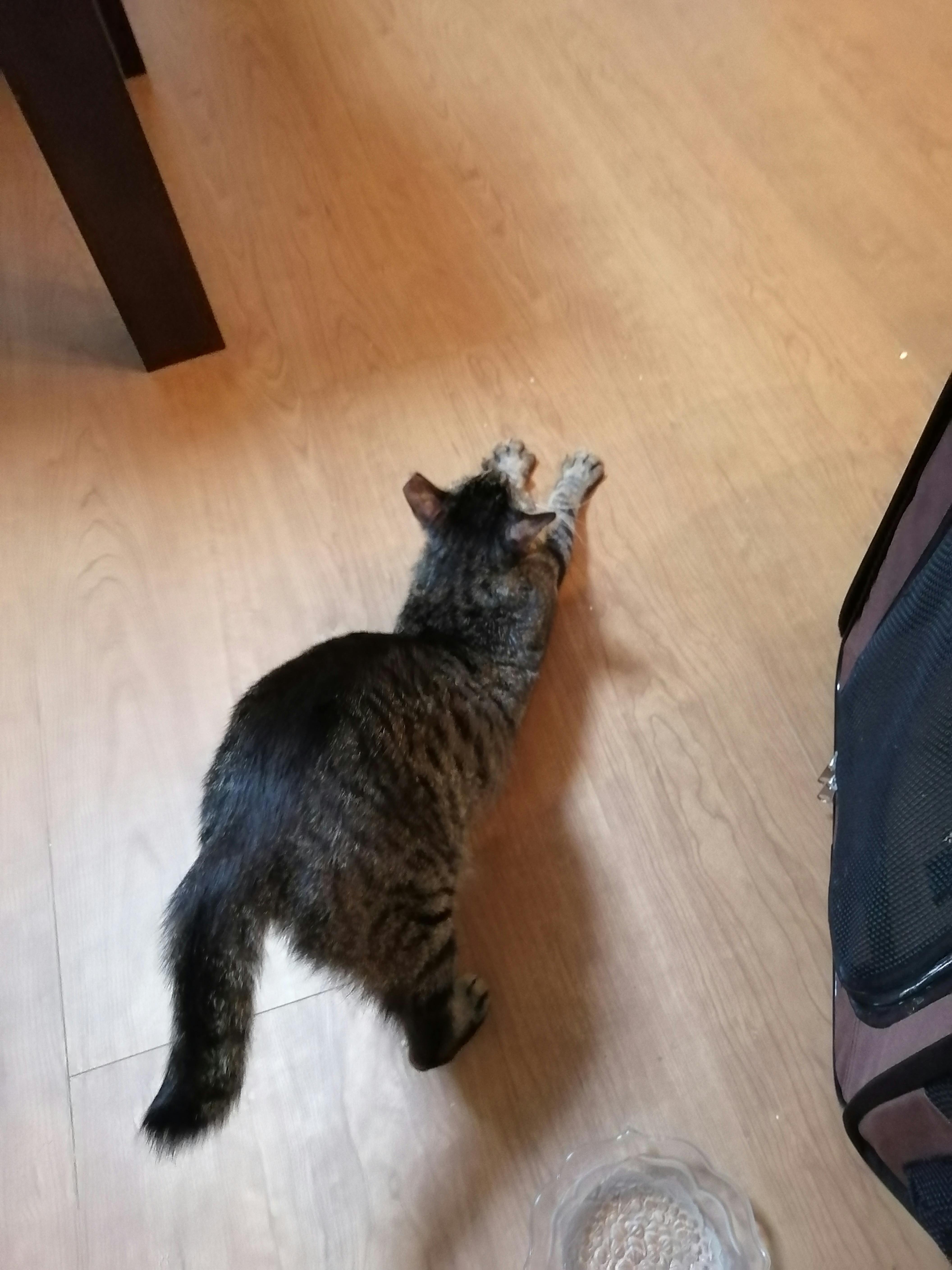 冒頭の写真は晩ごはん(ちゅーると薬のせ)をガツガツ食べ終わって伸びをしている姿です。