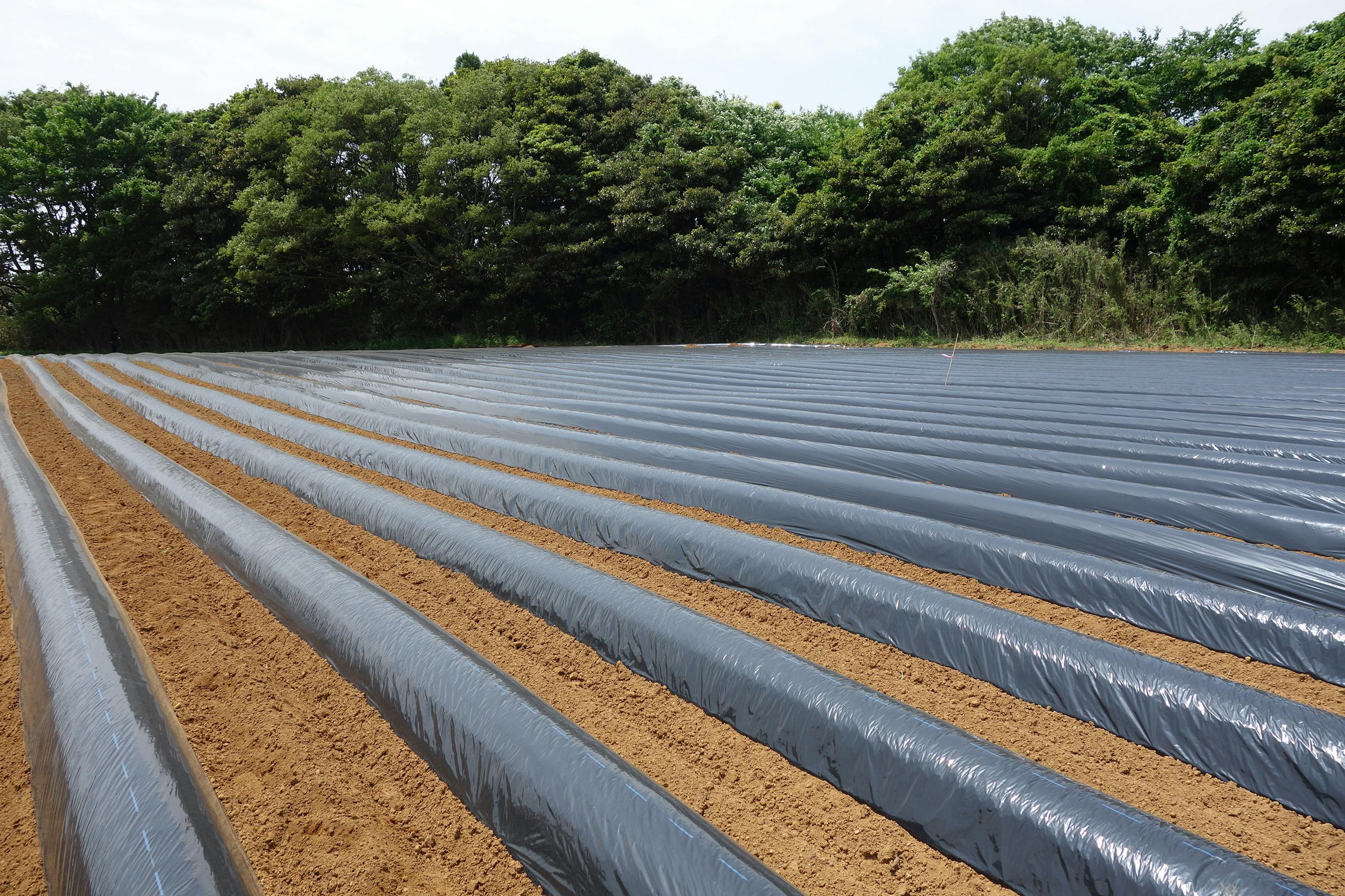 ※畑の土を細長く盛り上げたものを畝(うね)と言い、畝立てをすることで水はけが良くなり栽培管理がしやすくなります。また、畝の表面を黒色マルチで覆うことで、雑草を防ぐ、乾燥を防ぐ、地温を上昇させる効果があります。