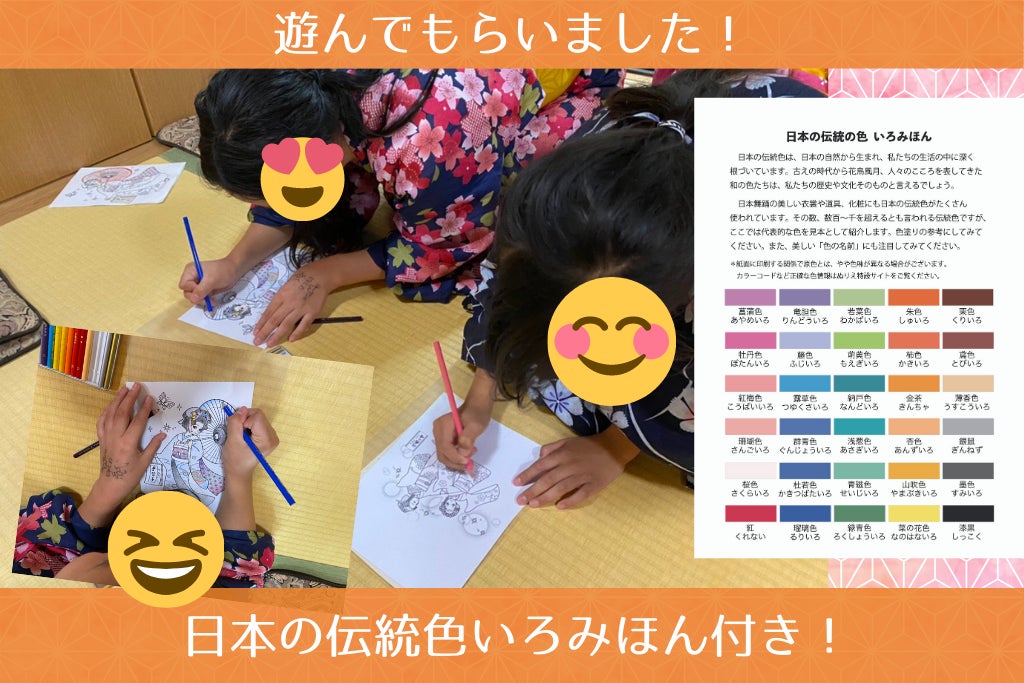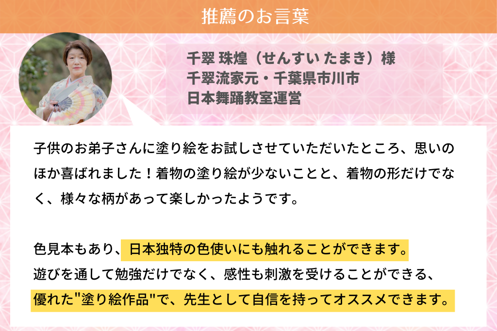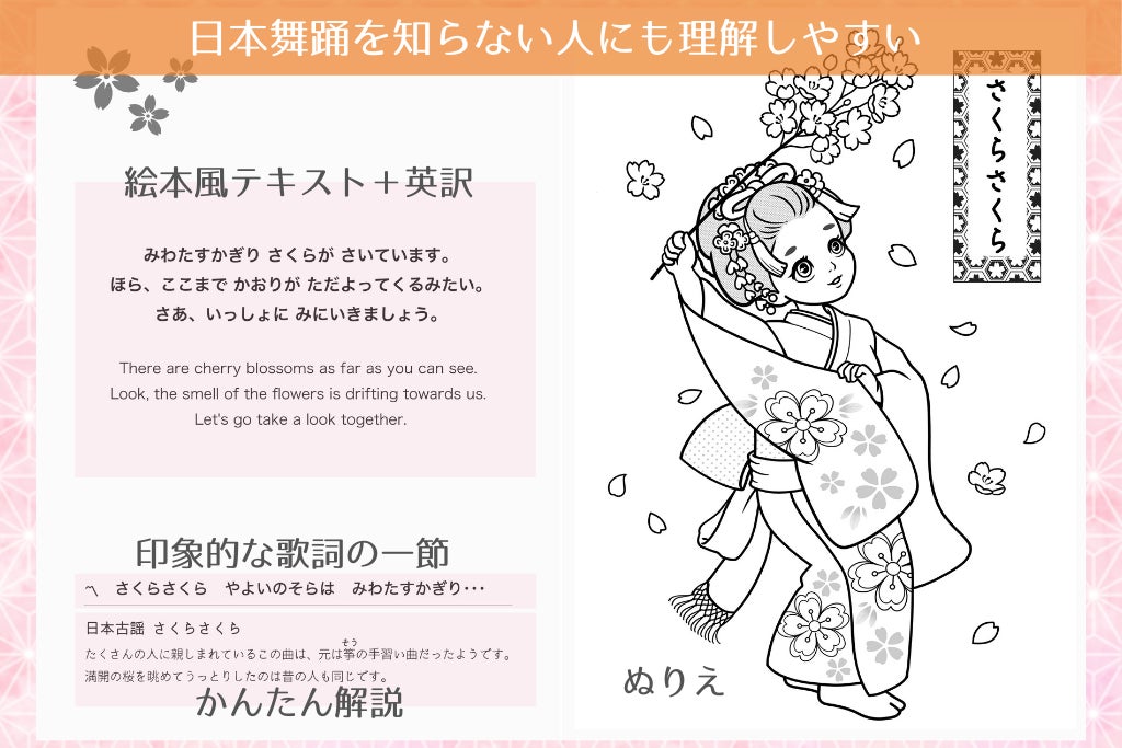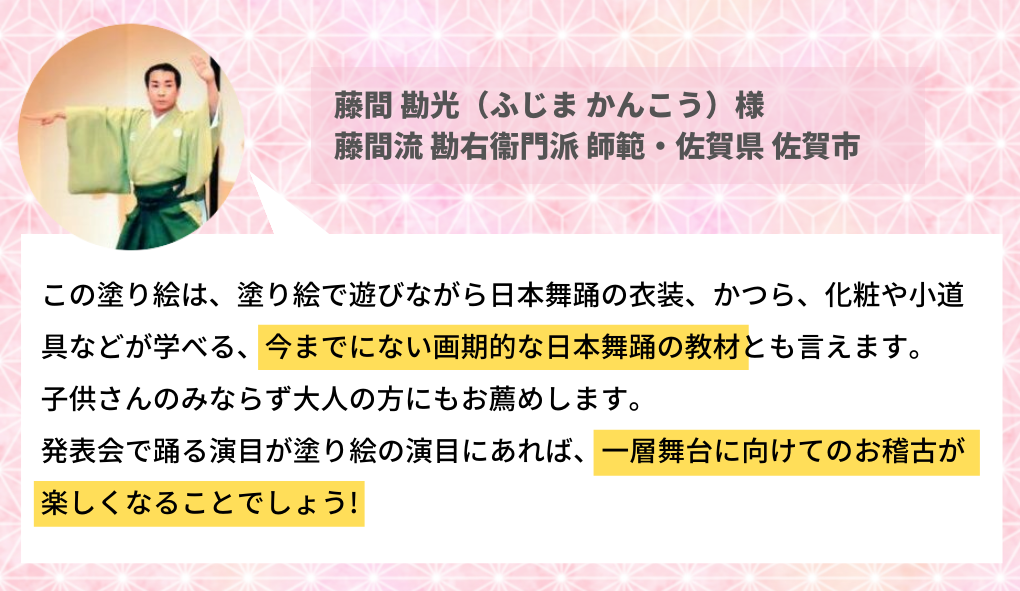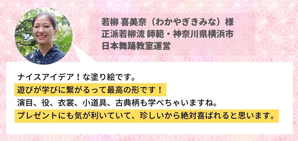 「日本舞踊の塗り絵」は、塗り絵として楽しいのはもちろん、これをきっかけに先生がいろんなことを教えてあげられるようにという想いも込められています。