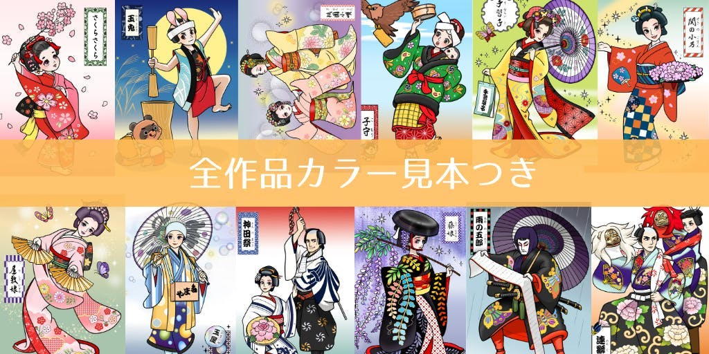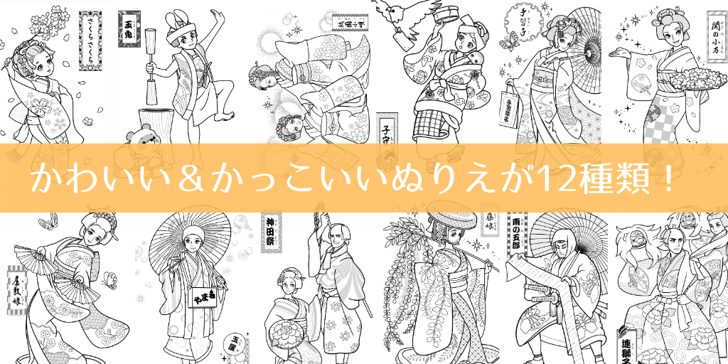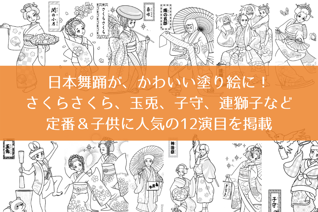 日本舞踊の定番演目、子供がよくお稽古する12演目をカッコイイ、かわいい塗り絵にしました。