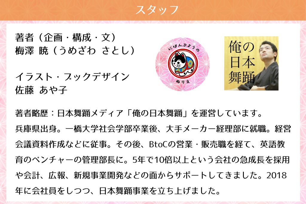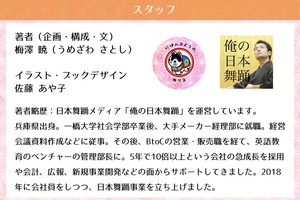 2020/12/07 16:14支援者が50名を突破!!!支援してくださった方が50名を超えました。ありがとうございます。こんなに多くの方に知っていただけただけでなく、支援をしていただき嬉しいです。そして、日本舞踊の魅力が、もっともっと広まればいいなと思います。支援はまだまだ募集中です。身近な方で興味をお持ちの方がいらっしゃれば、ぜひSNSやメッセージでシェアをお願いいたします。引き続き、よろしくお願いします!もうすぐ納品です!!!週が明け、製本が始まりました。みなさんにお届けする際のお礼状のポストカードもできました。早くみなさまにお届けしたくてウズウズしています!^^ぬりえを使ったワンポイントレッスンその2Twitterで、ぬりえのイラストを使った、ワンポイントレッスンの続きをお届けします。このぬりえは、先生や親御さんがぬりえを使って、子どもたちに日本舞踊のことを教えてあげる、そういう使い方も想定しています。このイラストを使って、こういうことを教えてあげてくださいね、というイメージです。たくさんネタがあって、つきないですね。あらためて日本舞踊は奥深い世界だと思います。梅澤のTwitterで毎日、更新しています。よろしければフォローして下さい! もっと見る