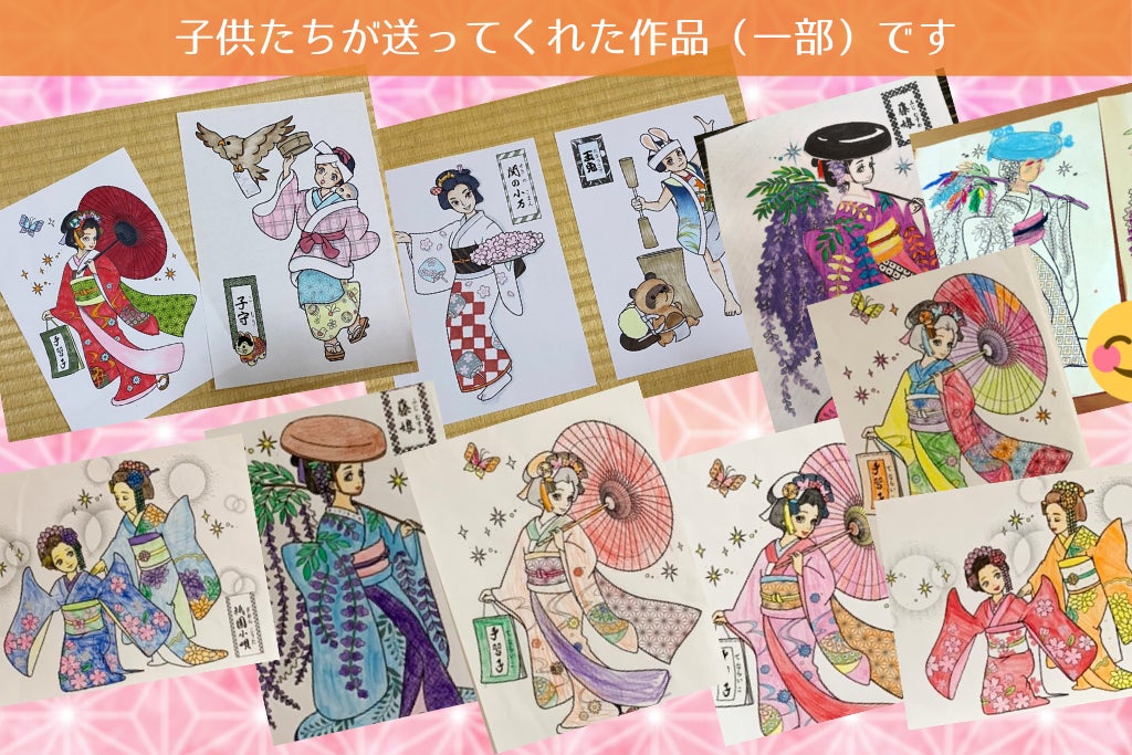 2020年4月、新型コロナウィルスの影響で学校にも、習い事にも行けない、そんな子どもたちの小さな気晴らしになれば、と「藤娘」「手習い子」「祇園小唄」の三つの塗り絵を作り、無料で公開しました。