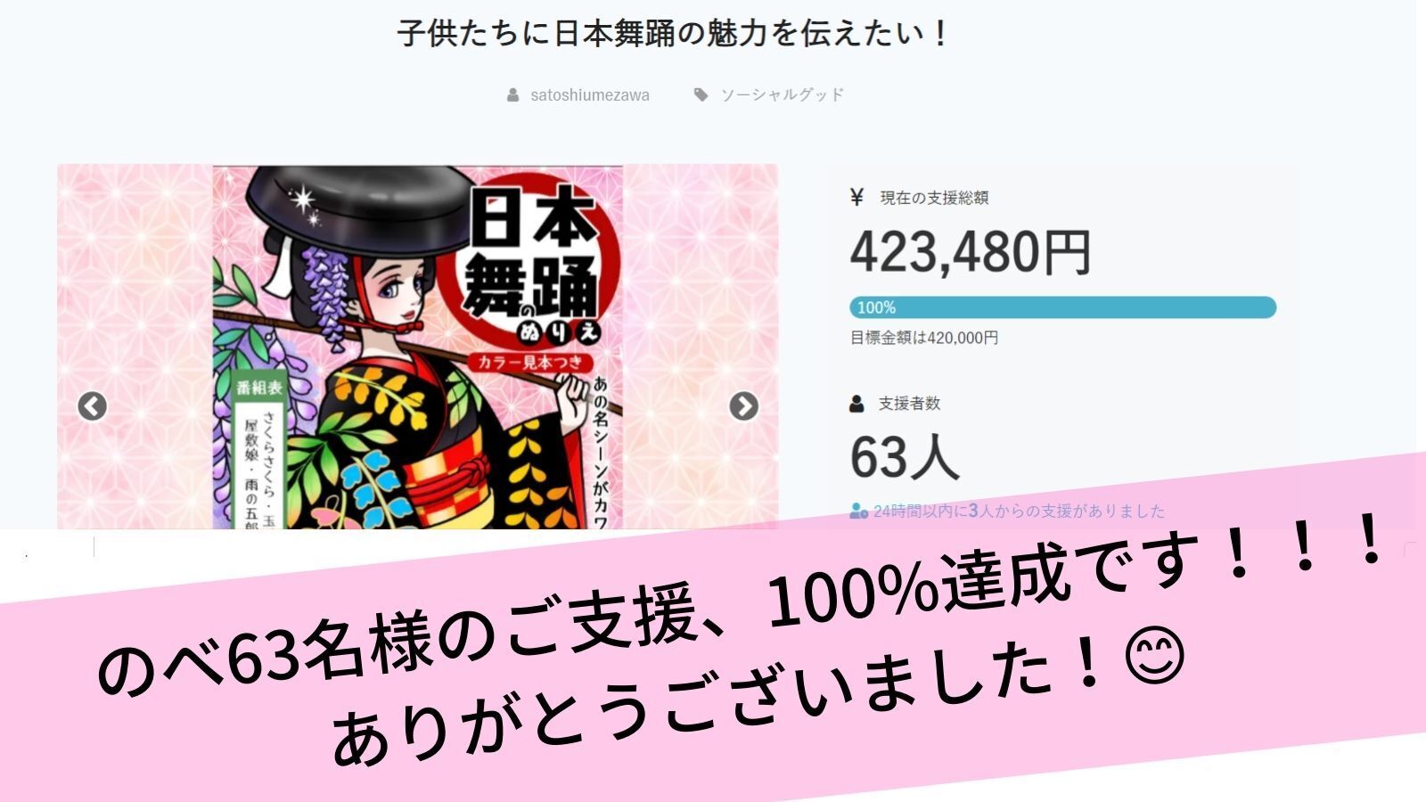 2020/12/14 20:29プロジェクト終了!100%達成です!ありがとうございました。昨日、クラウドファンディングが終了しました。ご支援、応援してくださったみなさま、ありがとうございました。結果は、支援総額 423,480円支援者数 63人達成率 100%で、無事、ファンディング成功です!みなさま、本当にありがとうございます。このプロジェクトの始まりは今年4月。緊急事態宣言が出されて、町のお稽古場からは、子どもたちの声が消えてしまいました。学校にも、お稽古にも行けない子どもたちのために、なにかしてあげたい。それで「藤娘」「手習子」「祇園小唄」の三つの塗り絵をつくってWEBで配布したのが5月でした。そこから約半年。9作品を加えた12作品で「日本舞踊のぬりえ」が出版されました。自宅で過ごす時間が、少しでも楽しくなれば、そして日本舞踊に触れる機会になったら・・・そういう気持ちで作り始め、日本舞踊をもっと学べて、もっと好きになって、コミュニケーションも増えるもの・・・と追及したのが「日本舞踊のぬりえ」です。みなさんから応援していただき、自信をもって世に送り出すことができます。より多くの子どもたちが日本舞踊の魅力を知ってもらえるように、引き続き活動を続けていきます。なお、今後はAmazonでネット販売していきますので、購入される方はAmazonへどうぞ。日本舞踊のぬりえ(Amazon)今後とも、日本舞踊のぬりえをよろしくお願いします。 もっと見る