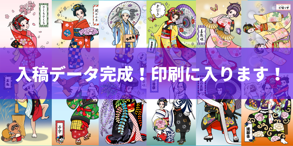入稿データが完成しました!最初の「日本舞踊のぬりえ」ができたのが5月初旬、「ぬりえブックプロジェクト」が開始されたのが8月。実に半年の歳月を経て、いよいよぬりえブックがこの世に誕生します!明日から印刷・製本スタート!カラー見本(全作品)です。明日、印刷会社にデータを入稿し、印刷・製本を開始します。印刷会社は東京都新富町にある神林印刷という会社です。60年の歴史を持つ老舗印刷会社です。新富町といえばかつて「新富座」があったことで有名ですよね。2週間で完成予定☝これは試作品です今回、「横のり(天のり)」という製本方法を採用しているため、通常の製本より、やや時間がかかります。 「横のり」とは、伝票を思い浮かべてもらえばわかると思いますが、きれいにはがせる製本方法です。色を塗ったぬりえをはがして、おうちやお稽古場の壁に貼れるようにという意図があります。だいたい2週間くらいで納品される予定です。楽しみでしょうがない!みなさんのお手元に届けれられるのが楽しみです。「こんなお着物着てみたいな!」「早くお稽古行きたい!」これは、私がぬりえブックを作ろうと決めた女の子の言葉です。こんな楽しい声が、町のお稽古場で聞こえてくることを想像して作りました。そんな想像が、いよいよ実現する!本当に、とても楽しみです。