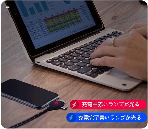 従来ケーブルの劣化しやすい、充電スピードが遅い、差し込み時に表裏の確認に手間がかかる、移動バッテリーを使う場合、落ちやすいなどの問題点をまとめて解決!