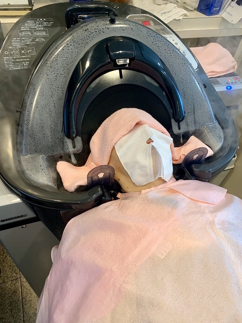 フードを被せたクローズ空間に湯気が充満し、蒸されながらシャンプーをすることで地肌をゆったりと芯から温めます。