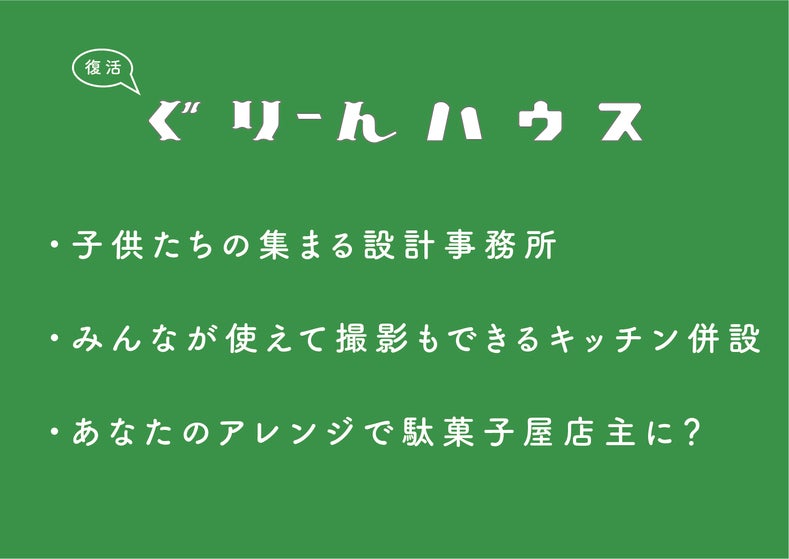 シェアキッチンのようなイメージで、日替わり、週替わりで近隣にお住まいの方に利用してもらい、『食』を通じた発信を積極的に行っていきます。駄菓子も口から体内に取り入れるものと捉え、例えば『健康志向の駄菓子』や『大人のための駄菓子』といった新しい考え方の商品を生み出したい、または駄菓子に限らず「食」について一緒に考えてくれる人とつながっていきたいと考えています。ゆくゆくはYouTubeなどの映像コンテンツにも対応できるようなキッチンにすることで、さらなる利用価値を高めたいと思います。