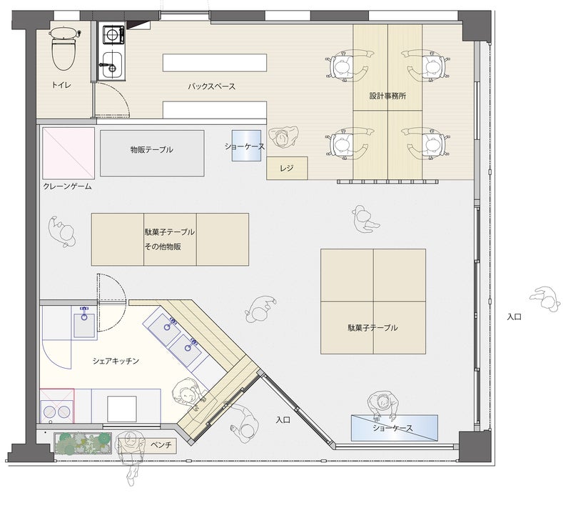 (設計事務所、駄菓子売り場、キッチン、が同じ空間に共存して混ざり合う)