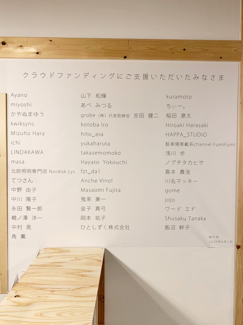 2020/06/07 03:05前回のマグカップに続きTシャツが完成しました! 大人用はぐりーんハウスのメインキャラクターでもある『ぞうさん』が左胸にワンポイントで入っていて、キッズ用は同じくオリジナルキャラクターの『バンビちゃん』が前面にあしらわれたデザインになっています。 大人用のこだわりとしては肉厚でザックリ感が出るように6.0オンスの生地を使っているので、ガンガン着てガンガン洗濯をしていただけるタフな作りとなっています。一方でキッズ用は肌触りにこだわったので着心地や素材感が感じられる風合いで毎日でも着たい1枚となっています。 Tシャツもマグカップ同様、店内で販売しますので欲しい方はぜひゲットしにいらしてください!そして今後も続々とラインナップを増やしていく予定なのでお楽しみに!! それとクラウドファンディング にご支援いただいたみなさまのお名前を壁面に掲示させていただきました。A0サイズで印刷屋さんに出してもらったので迫力あるサイズ感となっています(右下のシワは取りましたw) こちらは1年間店内に掲示しますので、お店にお越しの際はご自分のお名前があるか確認してみてくださいね。 またリターン品の発送についてですが、プランの中の『オープニングパーティーにご招待』に該当する方に関しては、その時に手渡しさせていただこうと考えています。当初は6月中に開催する予定でしたが、現在の状況を踏まえて少し様子を見たいと思いますのでもうしばらくだけお待ちいただけますでしょうか。この状況があまり改善されずにオープニングパーティーの開催が不透明になりそうだと判断した場合は郵送にて対応させていただきたいと思います。それ以外のステッカーとキッズTシャツのリターンにご支援いただいた方については準備が整い次第、発送を始めたいと思います。 もっと見る