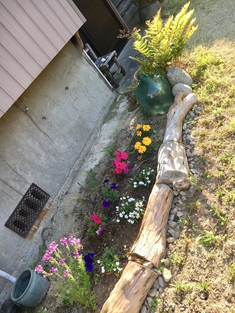 玄関前に花壇を作りました 少しさみしかった玄関前に花壇を作りました!色鮮やかなペチュニアなど、明るく綺麗な花を植えました