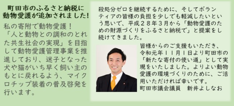今回は、「動物愛護のための財源づくりをふるさと納税で」と活動されてきた新井よしなお町田市議会議員からのコメントを掲載させていただきました。