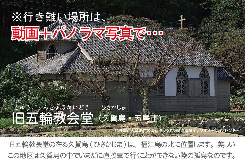 世界遺産「長崎と天草地方の潜伏キリシタン関連遺産」全12か所とその周辺について、バリアフリー観光(高齢者・車イス等)目線で「動画(空撮含む)」と「360°パノラマ写真」を作成し、インターネットやDVDで全国の皆様に提供しようとするものです。