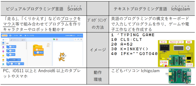 対してIchigJamはテキストプログラミング(キーボードで命令を入力する)です。基本的には画面は白黒で英語の命令(コマンドといいます。)を決められた構文で入力し、ゲームを作ったりセンサーをつないで距離を測ってモーターを動かす電子工作ができます。IchigoJam自体は、ノートパソコンの中身とおなじようなしくみを持つ基板(きばん)1枚です。ほぼ名刺サイズです。モニターとキーボード、電源をつないでプログラムを作ります。(表の右側)