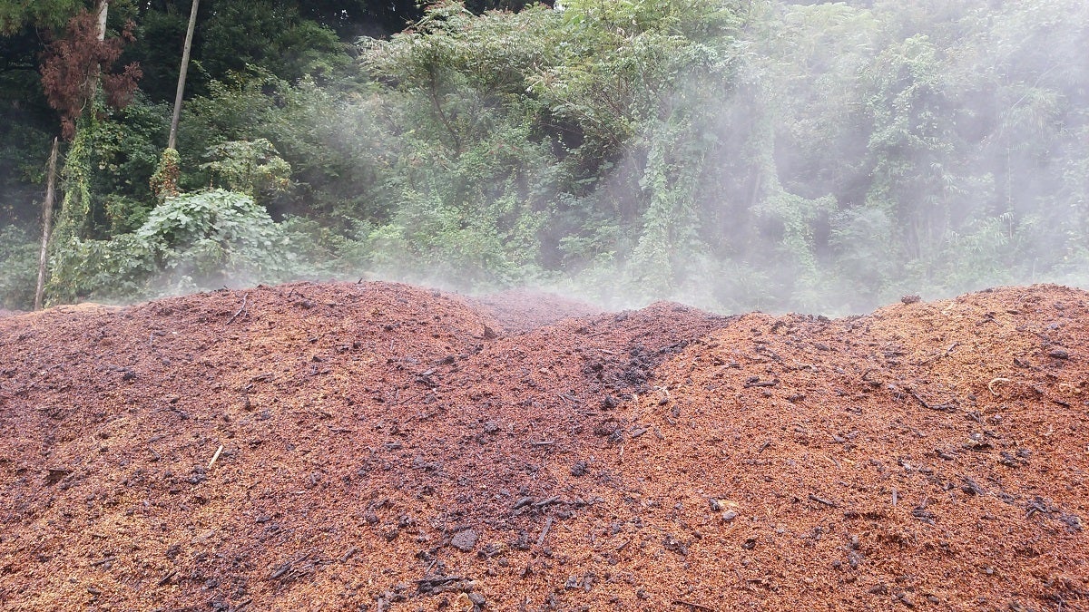 自宅横の堆肥場にて 温度が上がり湯気を発する堆肥