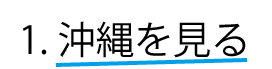 美しい海、サンゴ礁・シーサー、ゴーヤ、サーターアンダギー・サトウキビ畑、三線、エイサー、首里城、米軍基地、ひめゆりの塔、、、?