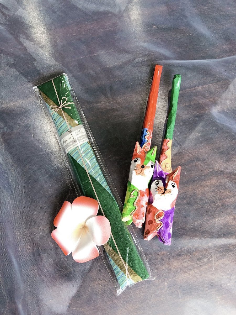 ふぞろいな表情がなごむ猫の木彫りとお香のセット。