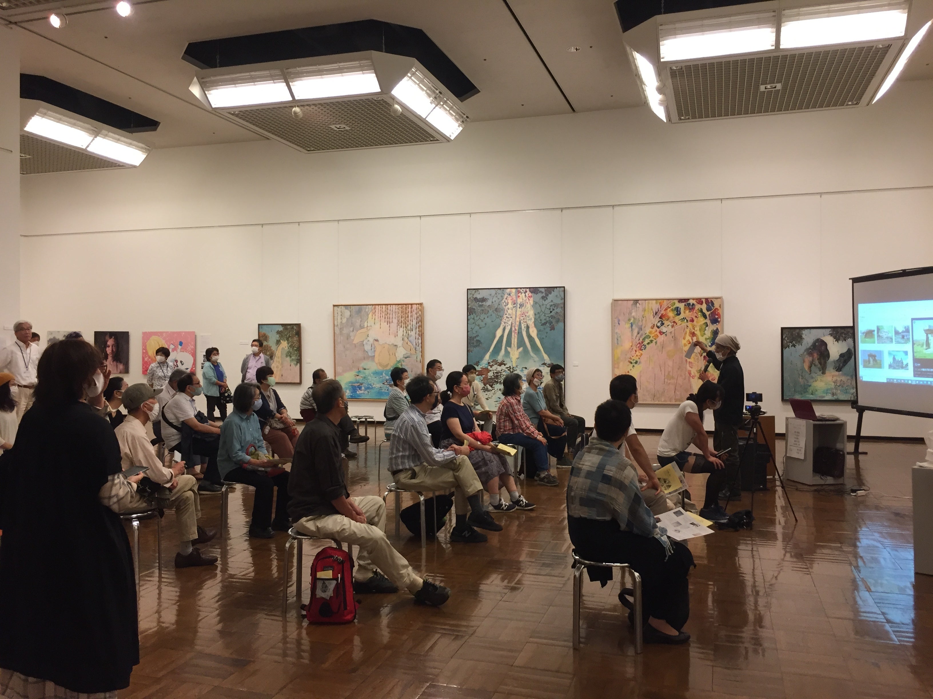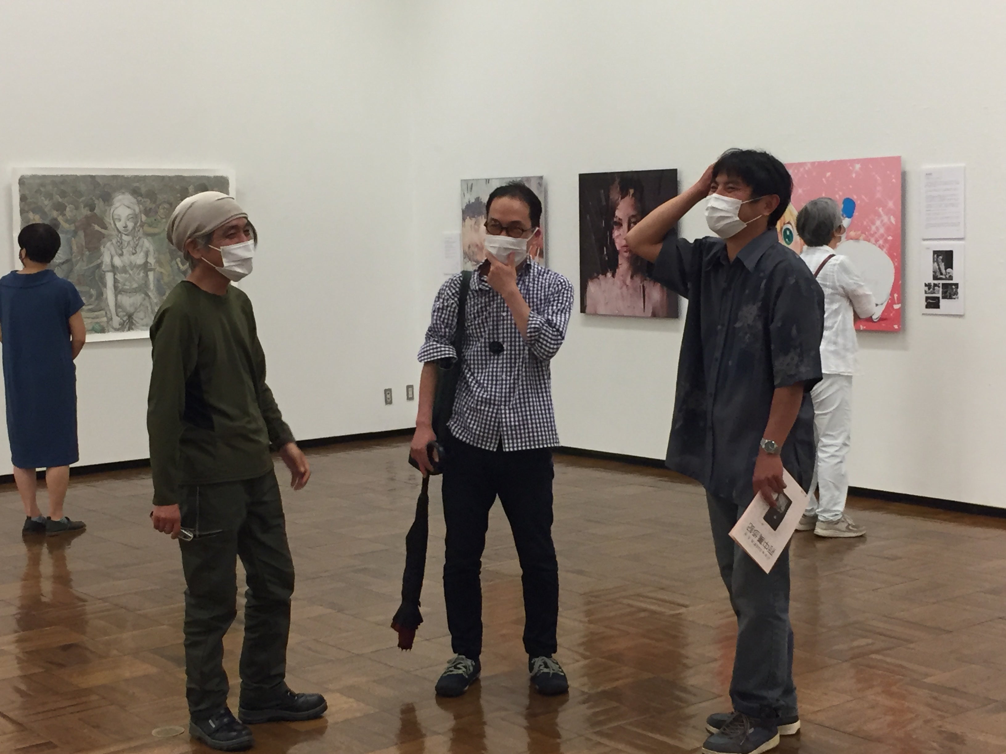 おかげさまで、たくさんの皆様にご来場いただき、いろいろなお声をかけていただいています。雨の日が続いたりですが、それはそれで静かにゆっくり作品を見られるのでよいものです。サブタイトルに「つながっていること つなげること」とあるのですが、展示でも同じテーマの絵が向き合っていたり、対照的なテーマが隣合わせだったり、色合いがグラデーションのように次の作家へ移って行き、「つながって」います。そして、本物の作品はやはり違います。エネルギーや、空間から感じるもの、作品の美しさ、色や質感、作家のメッセージ。その場でなければ体験できないもの。残りわずかの展示ですが、ぜひ多くの皆様にご覧いただけるようお声がけしています。新聞の取材なども入り、最終日に向けますますの盛り上がりを見せています。ご支援いただいている皆様、本当にありがとうございます。美術館の準備と展示でバタバタで、お一人お一人にメッセージやご連絡をお送りしたいのですが間に合っておらず、皆様の暖かいメッセージやご支援に日々励まされています。