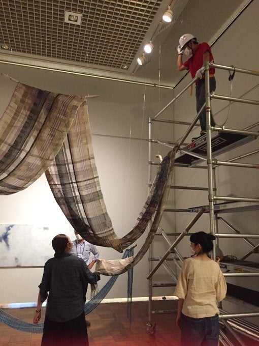 作家自ら高いところに登ったり、配置や特殊な展示方法に四苦八苦の体力勝負。閉館ギリギリ(過ぎていました、美術館の皆様ごめんなさい)で、滑り込みバタバタな搬入日でしたがなんとか無事終了!展示がとても素晴らしく、疲れも吹き飛んで美術展のスタートにワクワクします。