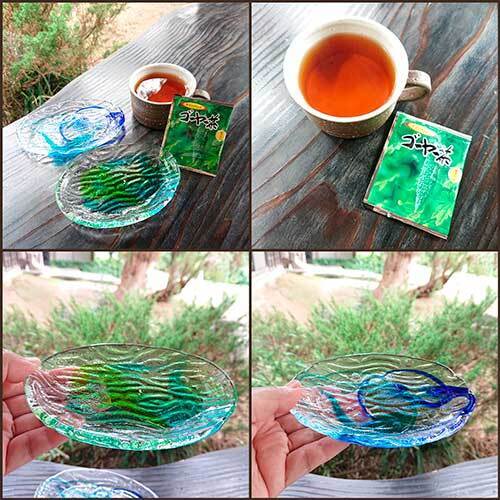 心地よいコクのゴーヤ茶と、琉球ガラス小皿2枚のセット。ゴーヤ模様の小皿は一枚一枚ハンドメイド。しっかりした厚みで、ティータイムでも食事でも、色々なシーンにご活用頂けます。