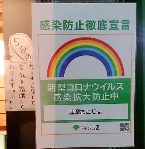 その皆様のご支援を支えに新型コロナウイルス感染防止対策を充実させ、入り口や洗面所などにアルコール消毒液の設置、トイレの共用タオルの廃止、カウンター席に飛沫防止板のご用意、店内には飛沫防止のビニールシートを垂れ、新型コロナウィルスの不活性化に有効性が証明された「オゾン発生器」クオフューチャーも設置しております。さらに地下なので換気が悪いのではないかとご心配する方々にもご安心頂けるようにサーキュレーターを5台置いて、換気扇も吸引力の強いものに交換するなどの工夫をして営業しております。東京都の「感染防止徹底宣言ステッカー」いわゆる虹色ステッカーも当然取得し、安心してご来店いただけるよう万全に整えております。