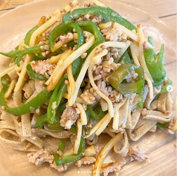 今回はキヌアやアマランサスが40%も配合されたもっちもちの平麺を使いました!パスタ麺として開発されましたが、中華の味付けにも合うんです