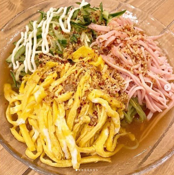 茹でて氷水で締めた麺に千切りにしたお好みの具材をトッピングし、上からたれをかけたらできあがり!