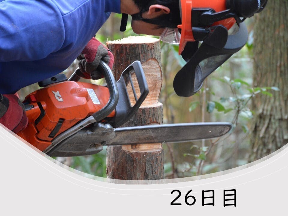 …と文章で書くのは簡単ですが、これが本当に難しい作業です。受口の下底は水平に切らなければ、思い通りの方向へまっすぐに倒れませんが、慣れないと水平で切っているつもりでも斜めになってしまいます。伐倒に関してベテランの千井さん曰く、‶伐倒はスポーツ” らしく、体の使い方を実践で覚えていくものらしいです。指導風景も「腰を落として」とか「肘の角度が…」とか、何か武道の稽古のように聞こえてきました。
