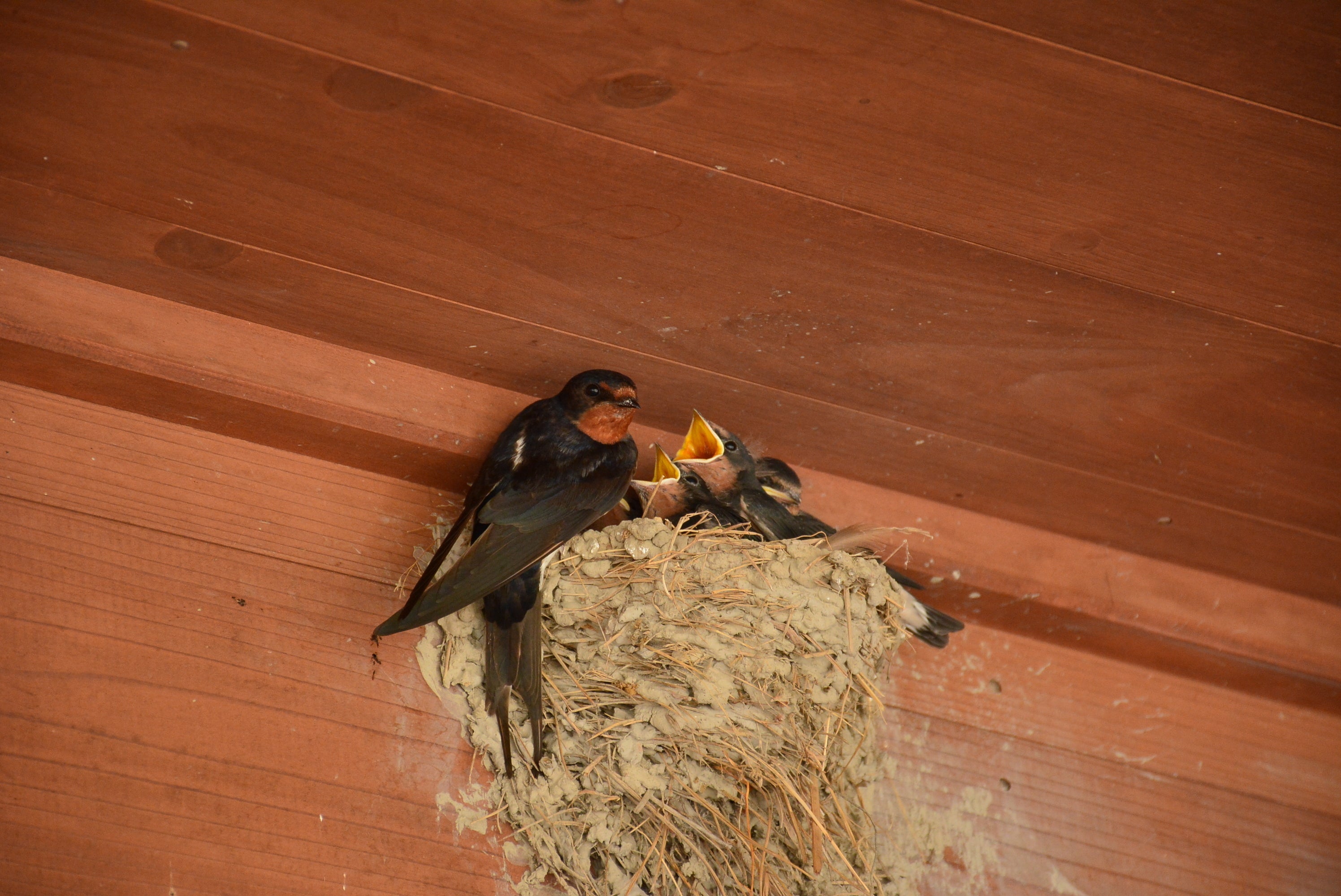 5月も中旬になり、和歌山研究林の周辺ではツバメが忙しく飛ぶようになりました。トップの画像はふもとの商店の軒下にあったツバメの巣です。沢山の子どもが餌を待っています。黄色いクチバシが可愛らしいですね。コゲラの巣