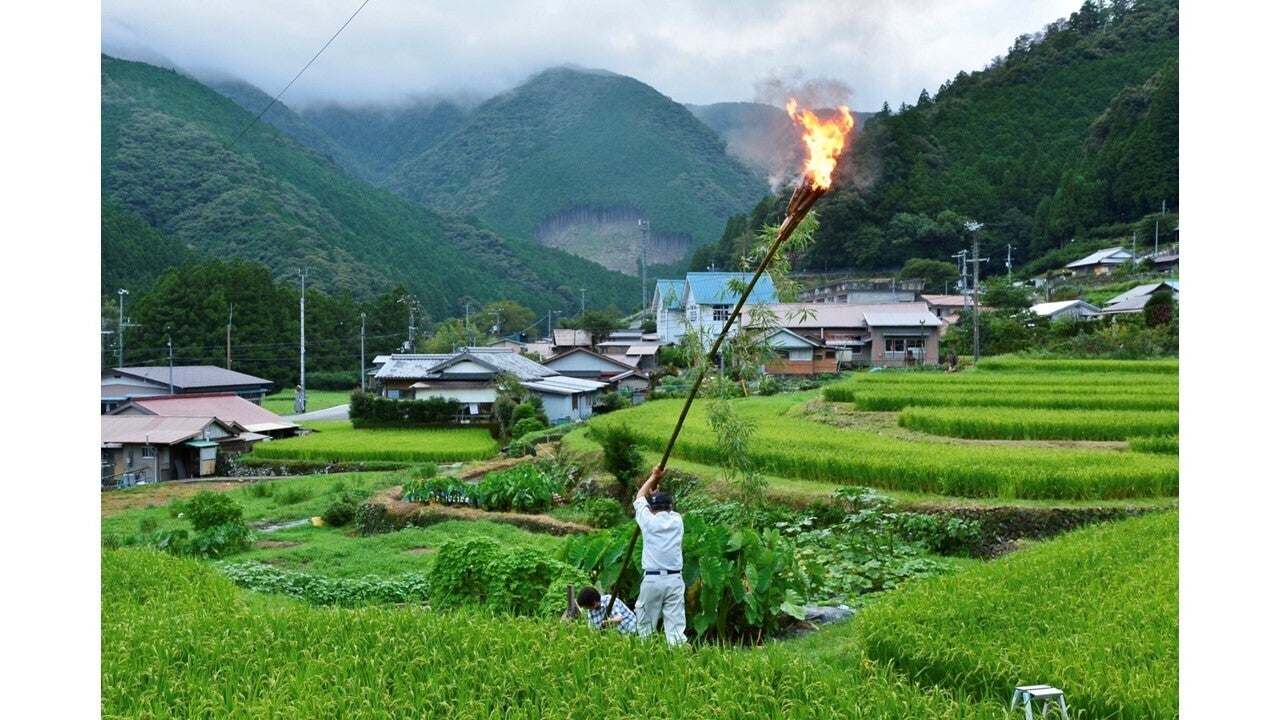 大きな竹の先に松明を取り付け空高く持ち上げるのです。スケールの大きさに少々驚いてしまいました。なぜこのような形で送り火を行うのかは分からないそうですが、「山の中だから高く上げとかないと見えないんとちゃう?」という地元の方の説が妙に説得力があります笑。