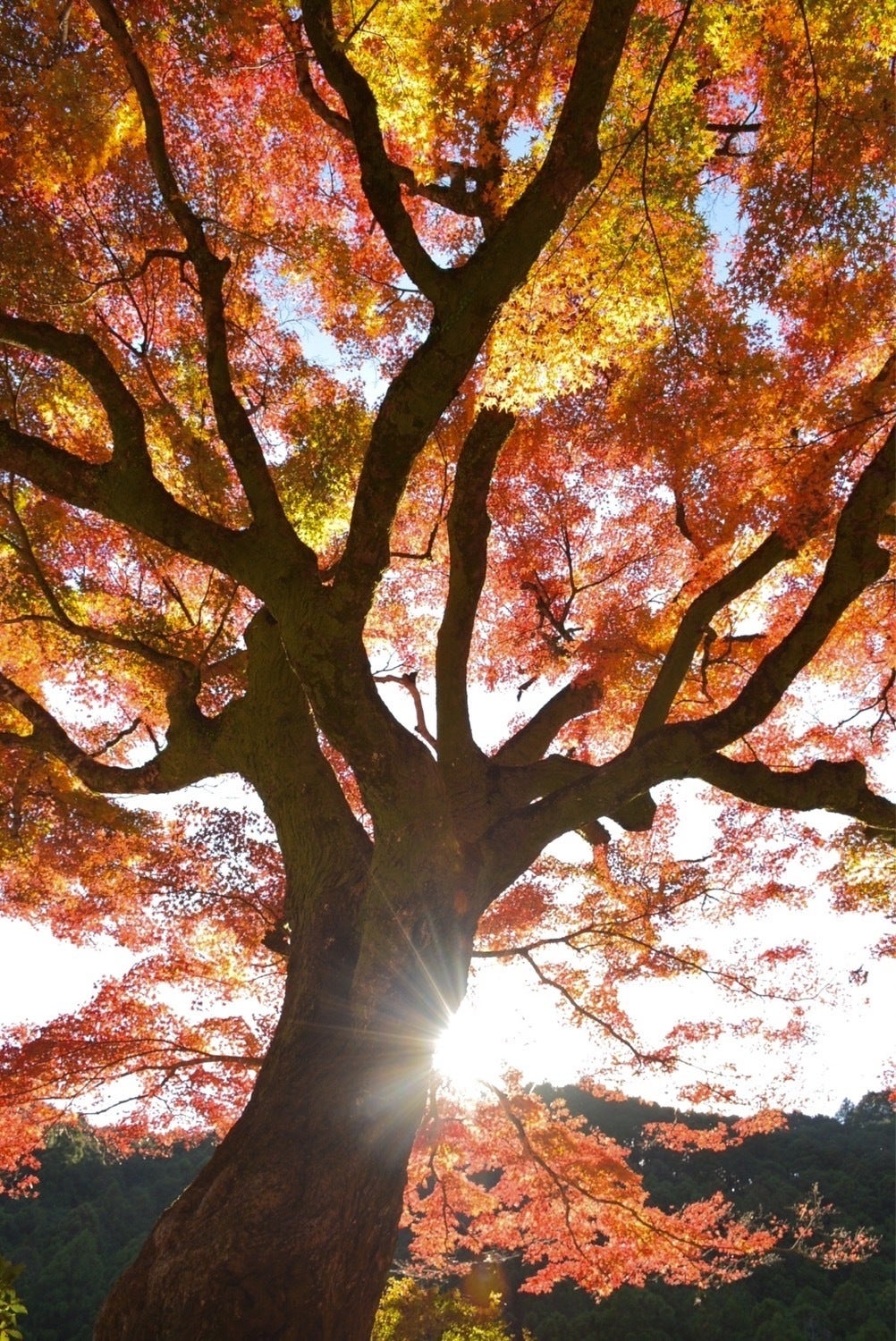 12月初頭、古座川町内ではイチョウやイロハモミジが所々で綺麗に紅葉していました。写真は平井とは別の支流である小川(こがわ)沿いにある田川集落というところのイロハモミジです。とても大きな個体が一本だけお寺の境内に生えているので、遠くからも目立っています。枝振りがとても立派で、力強いですよね!