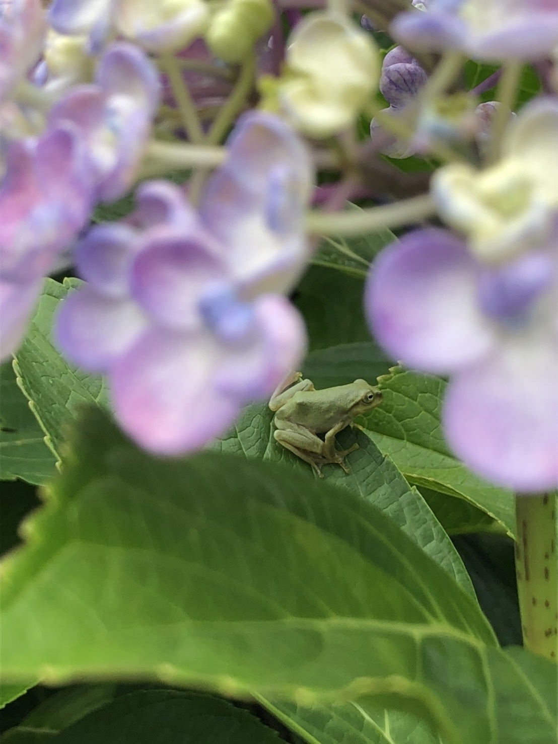 梅雨を代表する花、アジサイの下には、おたまから大人になったばかりの蛙やカタツムリが隠れています。生垣のアジサイの葉っぱは地上付近から幾重にも重なっていることが多いので、かっこうの隠れ家になるのかもしれません。それにしても、カタツムリとアジサイは似合いますねぇ。