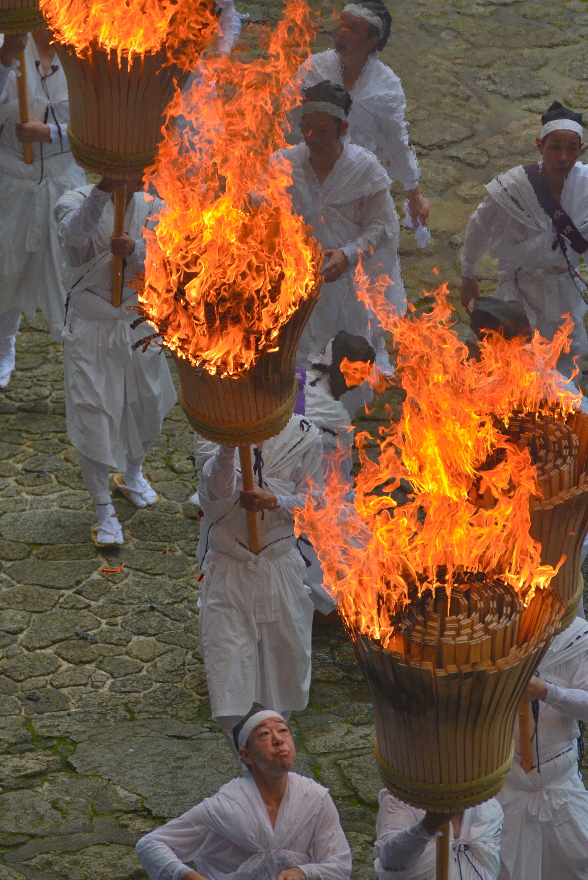 全国的にも有名なこのお祭りの一番の見どころは、50kgを越える松明を持って石段を駆け上がったり駆け下りたりする御火神事です。扇を御輿にしてやってくる神様たちを迎えに行くために行っているとのことです。