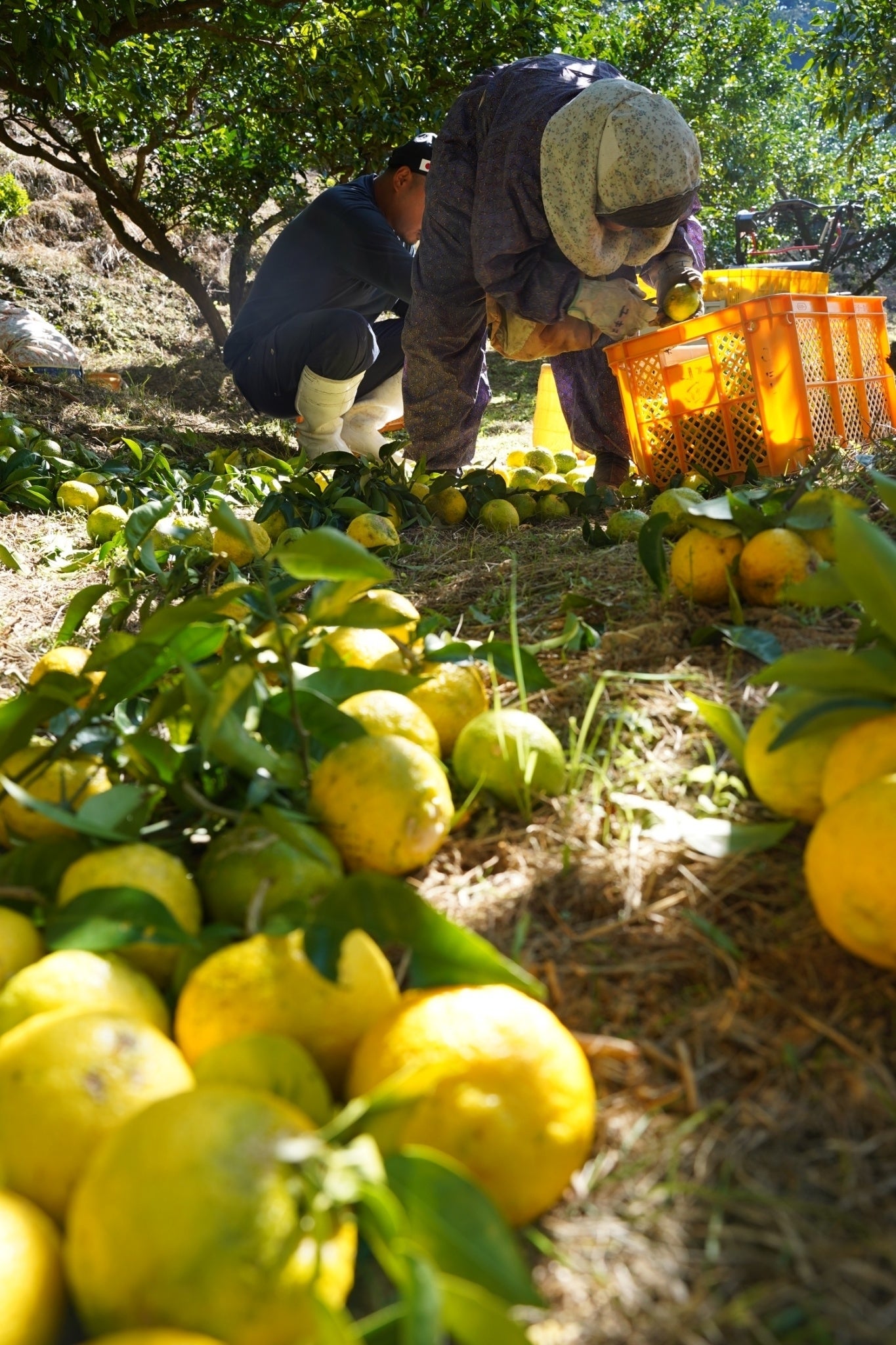 今年はお手伝いしつつ、写真を撮らせてもらう機会がありました。柚子の木は棘だらけで、手に刺さるわ、頭に刺さるわ、靴は貫通してくるわ、やっかいな木です。平井に来て1年目の際に、痛い思いをしたので、今年はヘルメットを被り二重に服を着て登山靴で挑みました。その結果、だいぶマシになりましたが、手を伸ばしたときに手首が露出して、その部分だけミミズ腫れになっていました。なんだか耳なし芳一みたいですね笑。