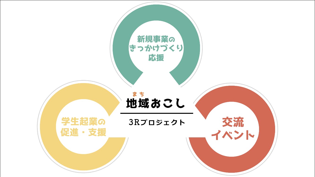 その名も「Regional Relationship Recovery~世代を越えた地域のつながりを取り戻そう!~ 」頭文字をとって3R(スリーアール)と私たちは呼んでいます。これまで、私たちは、企業と学生をつなぐイベントを行ってきましたが、「地域(まち)おこし」により直接的にコミットするんだ!という意思表明でもあります。概念図は、以下のとおりです。