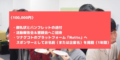 【御礼状/パンフレット送付/活動報告会と懇親会にご招待/ツナグコトプラットフォーム「Natto」への1年間スポンサー名を掲載】