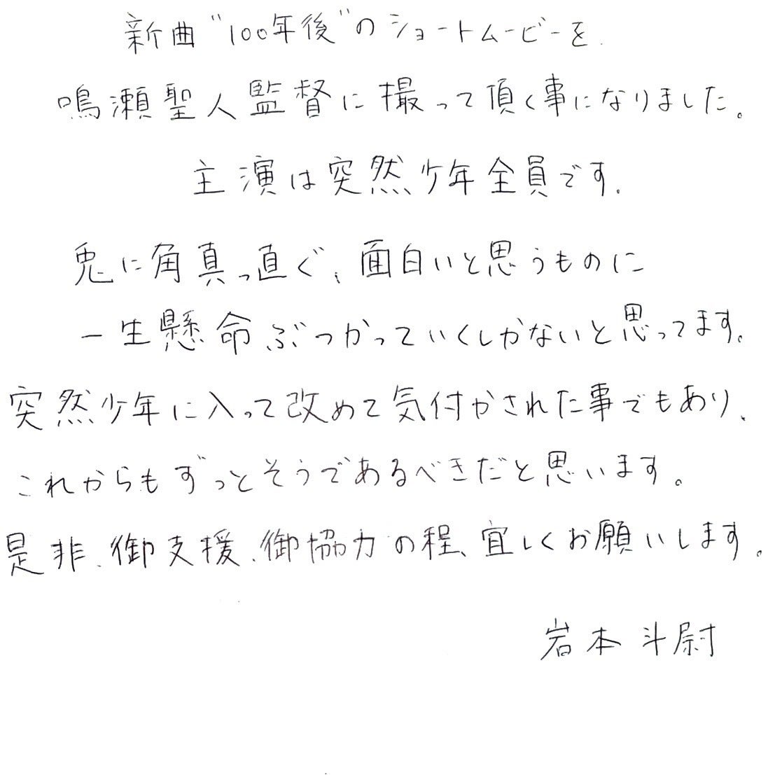 2020年10月21日発売、突然少年の2ndアルバム『心の中の怪獣たちよ』に収録されている「100年後」をテーマにショートムービーを作成。監督に同世代の鳴瀬聖人、アートワークを櫻井万里明、主演突然少年。