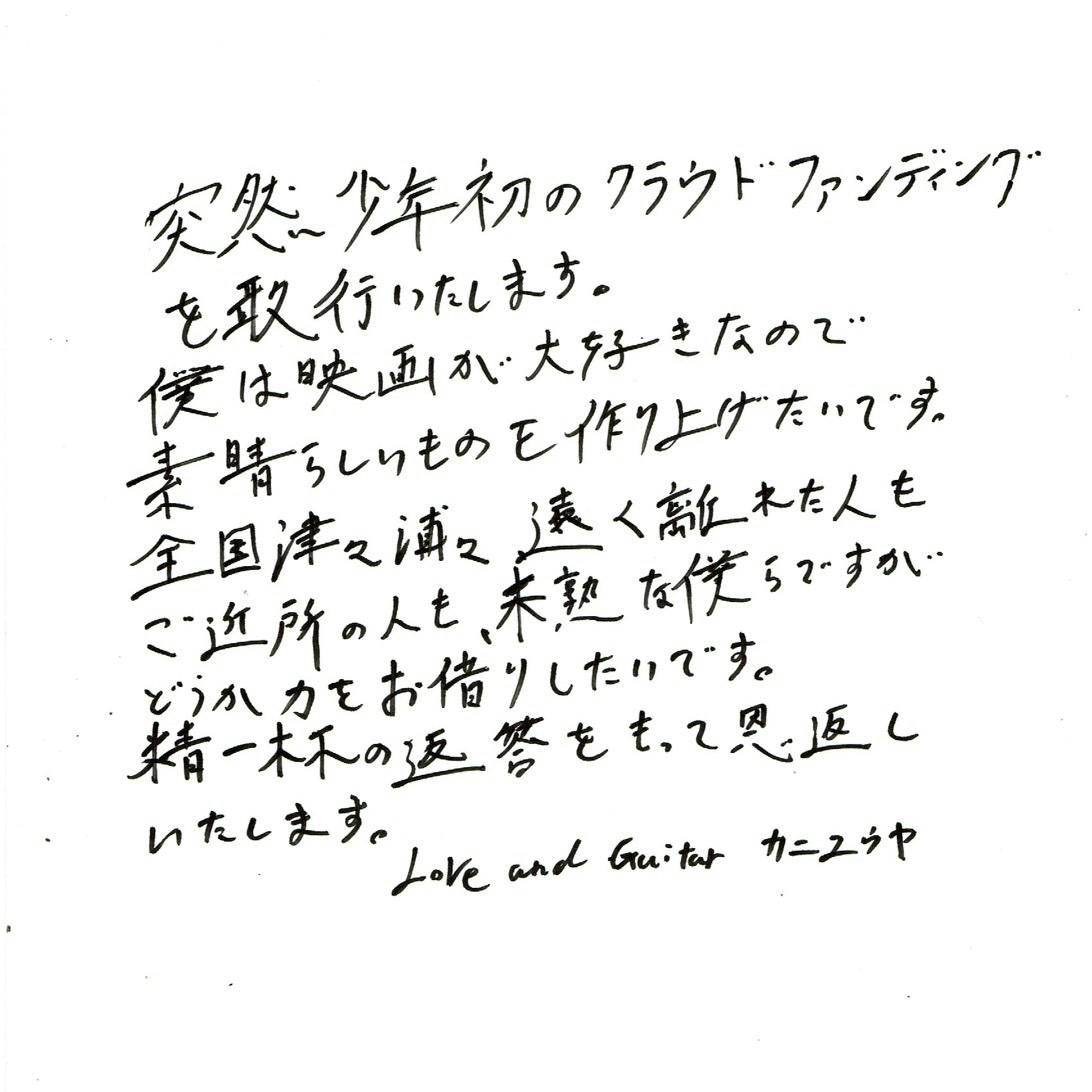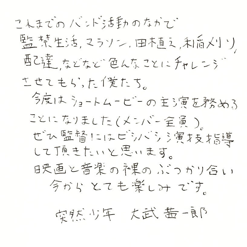 コロナウイルス感染拡大防止の観点から、3月より突然少年の主戦場であったライブは相次いで中止となりました。この間、突然少年は配信ライブをしてみたり、UberTots(新作CDをご注文頂いた方のご自宅に、メンバーが自転車で配達するという企画)をしたり色々なことに挑戦してきました。しかし、突然少年のふつふつと湧き出るキモチはどうにも溜まっていくばかりの様です。そのエネルギーを発散するかの如く、突然少年恒例の?体当たり企画、今回はショートムービーの主演に挑戦します。はちきれんばかりの突然少年と、鳴瀬監督の化学反応はどうやら大変なことになりそうな気がしています(とてもいい意味で)。そしていつも色々な方に力を借りてきた突然少年、今回はクラウドファンディングを使ってさらに多くの人に力をお借りしたいと思っています。お借りしたパワーの何倍ものパワーをお返しできればと思っています。