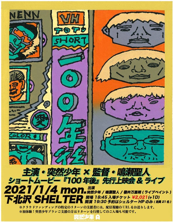 2020/12/18 20:10こんばんは!クラウドファンディングの多くの皆様のご支援本当にありがとうございました!皆様のお陰でショートムービー『100年後』は完成までもう少しのところにきています!リターンの内容にも書いておりました先行上映会を2021年1月4日に実施します!当日はショートムービーの先行上映、鳴瀬監督と突然少年のトークショー、突然少年のライブ、またライブ中にはアートワークを担当してくれた櫻井さんがライブペインティングと盛り沢山の内容になってます!!!先行上映会がリターンに盛り込まれたプランに支援されていた方には、当日までに視聴用のURLをお送りいたします(アーカイブも一定期間残ります)。また、初体験!突然少年プランをご支援頂いている方はその権利を行使して当日会場にご入場いただくことも可能です!対象の方には追ってご連絡させて頂きます。ーーーーーーーーーー2021/1/4(月) 下北沢SHELTER【ショートムービー『100年後』先行上映会&ライブ】突然少年鳴瀬聖人櫻井万里明(ライブペイント)開場 18:45 開演 19:30チケット¥2,021(+1D)チケット受付は下北沢SHELTERのみ。http://www.loft-prj.co.jp/SHELTER/ーーーーーーーーーーリターンの準備も着々と進めております!お楽しみに! もっと見る