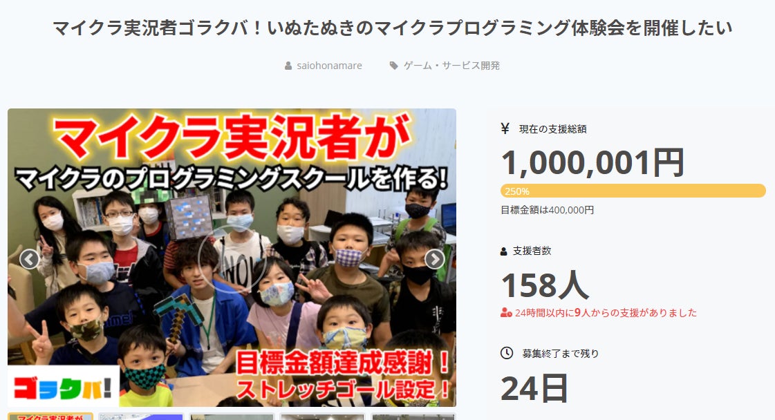 総支援額が100万円を突破しました!目標達成率250%まで来ました。