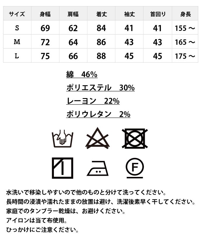 ポリウレタン糸を使用しています。ポリウレタンは年月の経過とともに劣化し糸の飛び出しや伸縮性が失われることがあります。熱によって縮み易いためアイロンがけは取扱表示に従ってください。