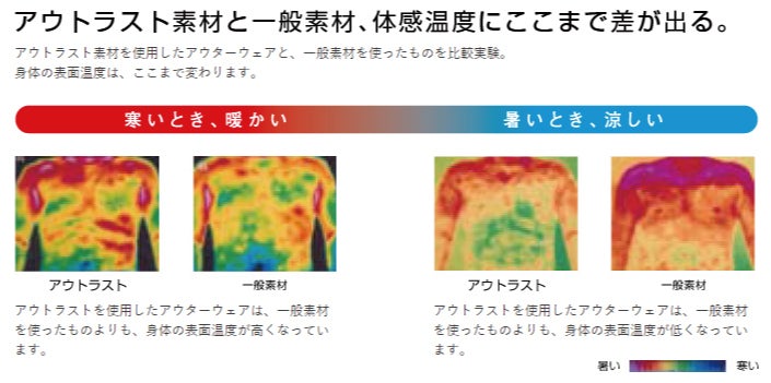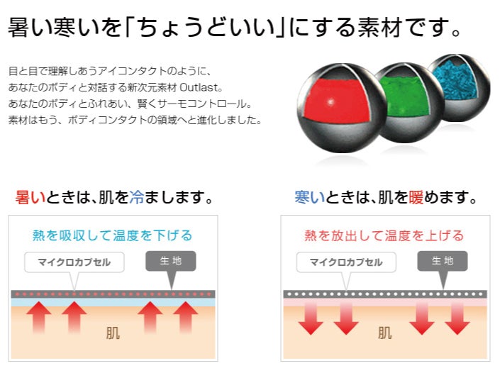 「少し暑い」時は熱を放出して涼しく、「少し寒い」時は熱を閉じ込めて温かく感じさせてくれる特殊な素材、それが「アウトラスト」です。