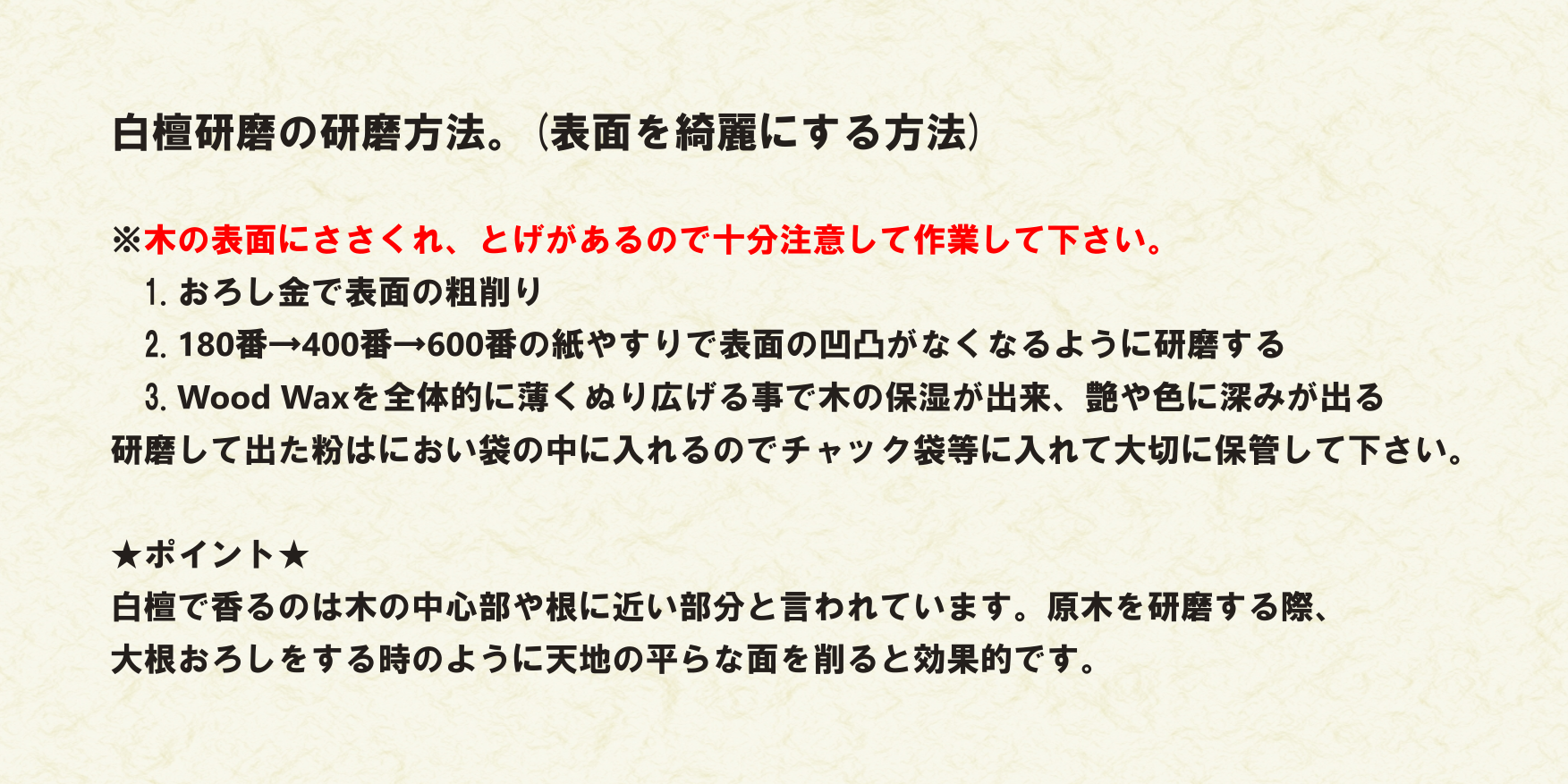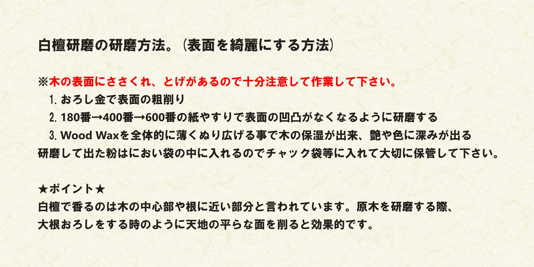 また、非常に硬い木材のためノミが欠けてしまう事があるようですが仏像の材料として人気があり、仏教儀式の道具の材料としても利用されています。硬い性質を利用して、表面を研磨しキットに含まれるWood Waxを塗る事により、艶と深みが出てきますので、自分好みに磨き上げて部屋のインテリアとしてもお使いいただけます。そして研磨した粉はにおい袋などお香の原料として使うことが出来ます。