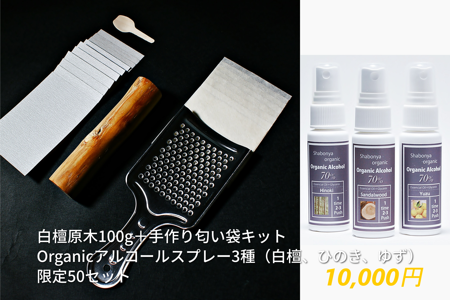 ⑥100g相当原木+手作り匂い袋キット & Organicアルコールスプレー3種(白檀、ひのき、ゆず) 10,000円(限定50セット)