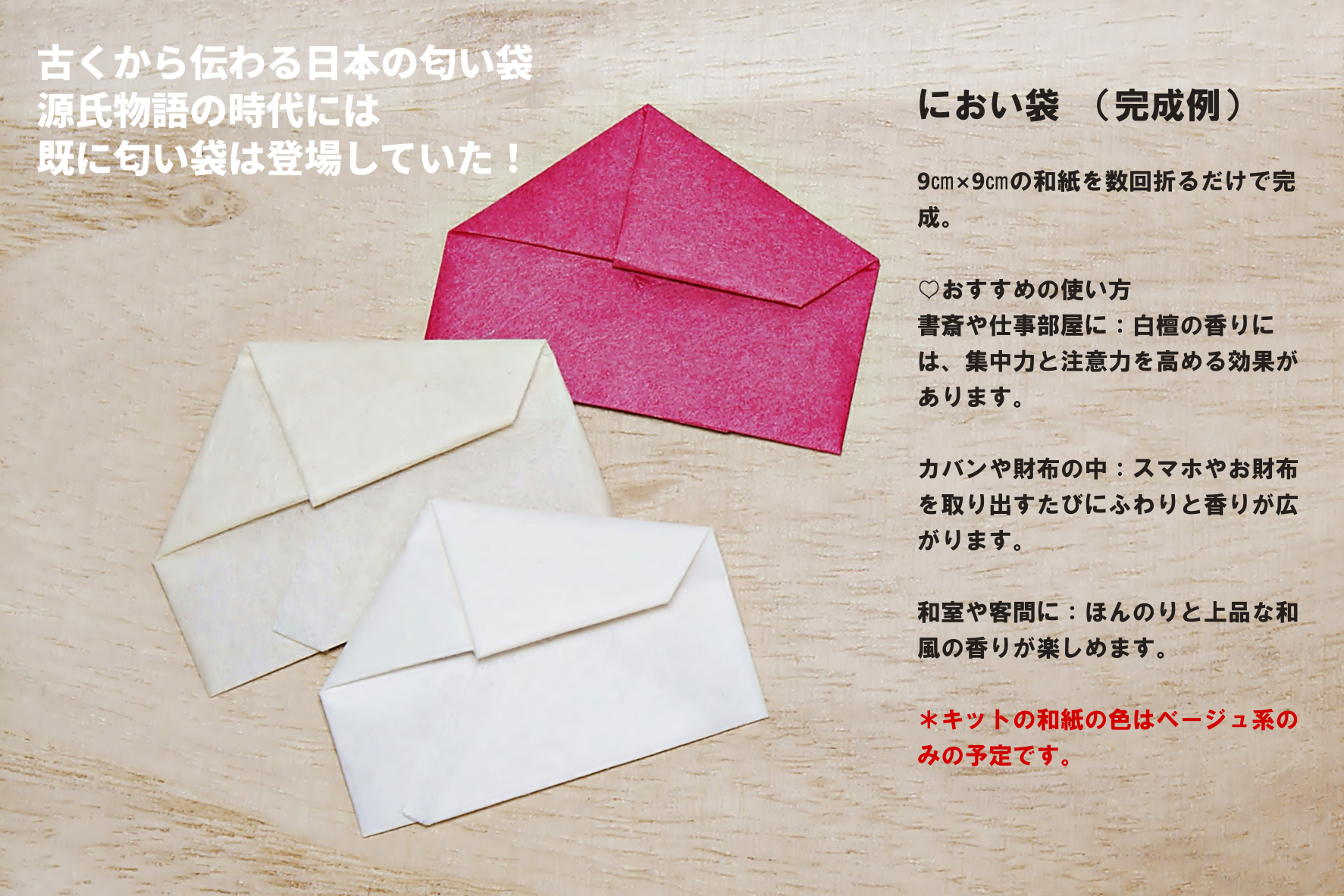 におい袋は和紙を使用し、においの元は原木を研磨した際に出る白檀の粉。木が持つ温かみや香りは人を癒します。大切な方へプレゼントにもおススメです。香りで紡ぐあなたの思い。