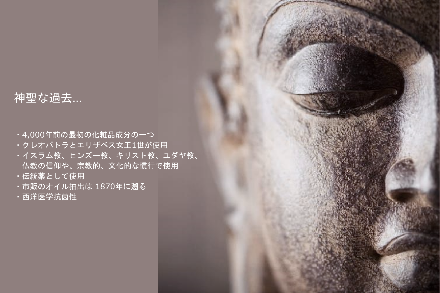 白檀には様々な効能がありますが、オイルと木材が美しい香りと優れた癒し効果を持つことから、何十世紀経っても、高く求められ続けています。