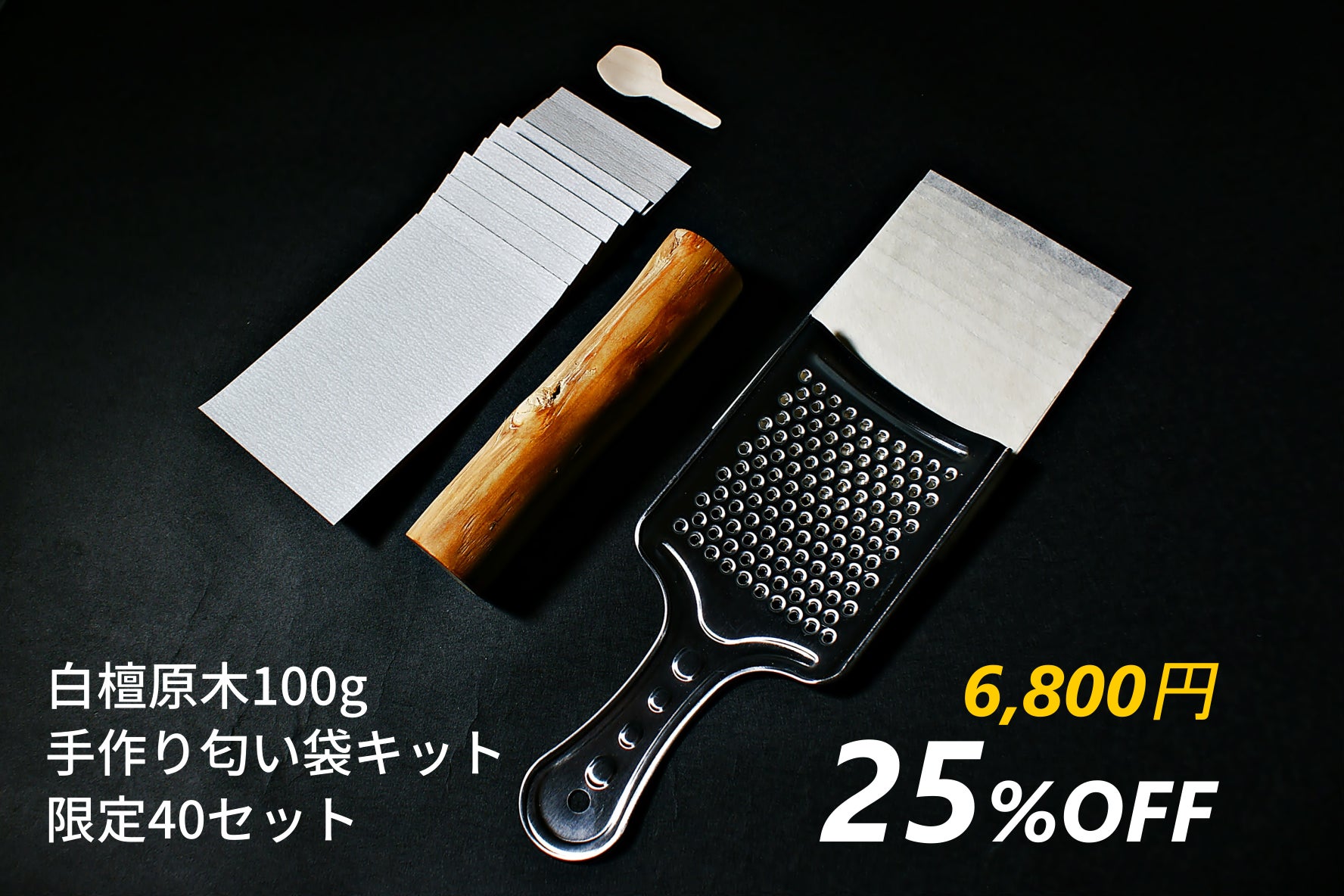 白檀の香りは古代より親しまれており、世界的にも人気の高い木材です。特にインドの白檀の中でも貴重種の(サンダルウッドアルバム) は香りが強いのが特徴です。ほんのり甘い、エキゾチックな香りです。この希少価値の高い白檀の原木を使用した”手作り匂い袋キット”を、コロナ禍によりストレスが溜まってしまった方々に癒しをお届けしたい。