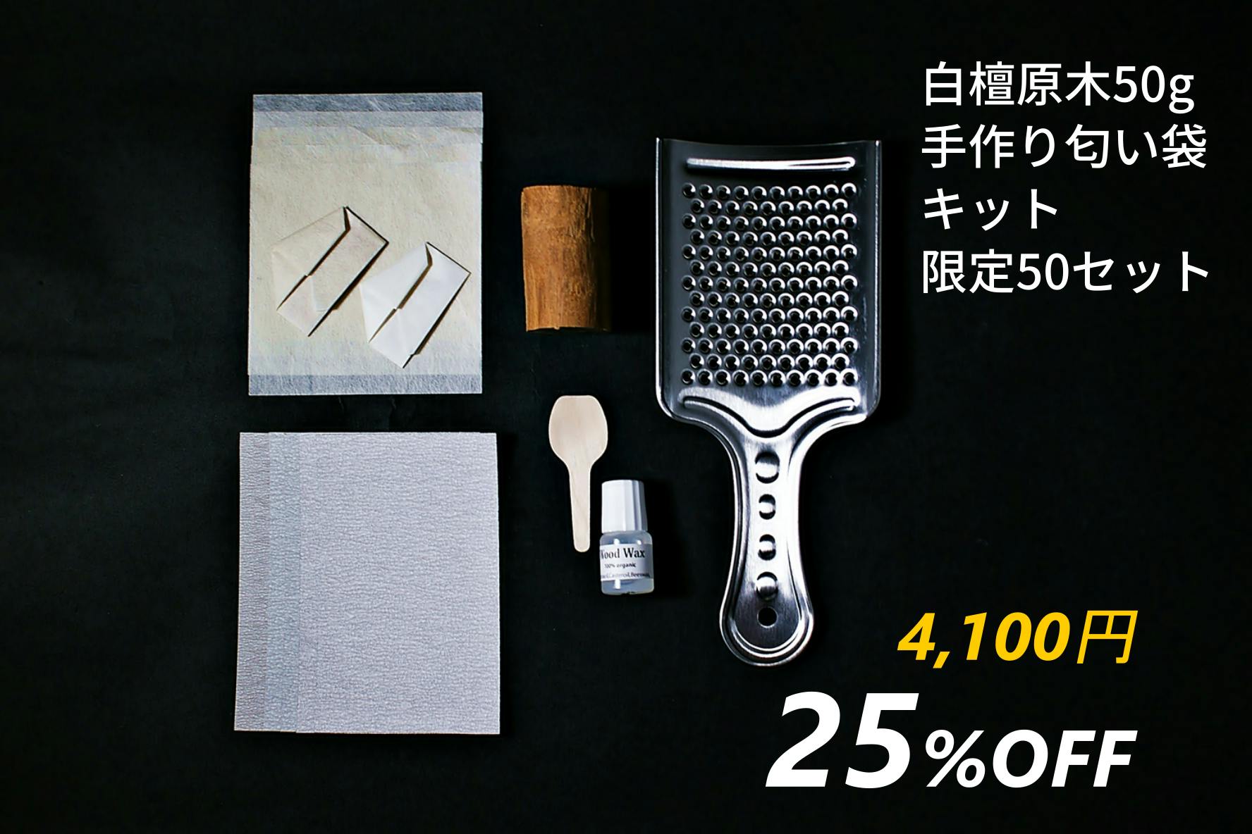 【50gの白檀原木+手作り匂い袋キット】です。