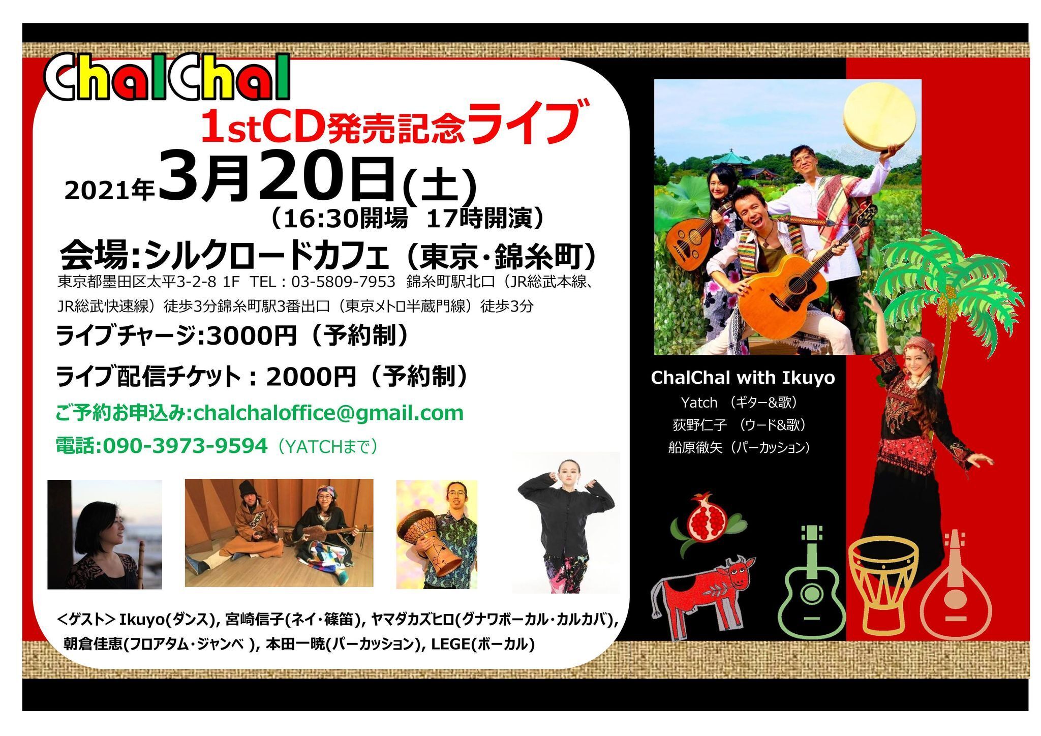 3月20日CD発売記念のレコ発LIVE@錦糸町シルクロードカフェの詳細が決まりました!レコーディング参加のミュージシャンのみなさま全員ゲスト出演、そしてミュージックビデオでもステキな踊りを披露してくれたダンサーIkuyoさんも出演という超豪華ラインナップでお届けします!生ライブのお席はコロナ感染拡大防止のため限定でクラファン一万円以上の支援者様優先ですが、まだ少し空きありますしライブ配信もありますのでぜひお申し込みください。【ChalChal 1stアルバムCD発売記念ライブ3.20】日時:2021年3月20日(土)16:30開場17:00開演予定(ライブ配信あり)会場:シルクロードカフェ(東京・錦糸町) 東京都墨田区太平3-2-8 1F 03-5809-7953 https://www.silkroad-cafe.com/ 錦糸町駅北口(JR総武本線、JR総武快速線) 徒歩3分 錦糸町駅3番出口(東京メトロ半蔵門線) 徒歩3分 ♪ライブチャージ:3000円(予約制)*ChalChalのクラウドファンディングで一万円以上のコースを選ばれた支援者様にはチケットが付いております。(さらに当日会場でチケットと引き換えにサンクスプレゼントもお渡しします!)それ以外の方はご予約お願いします。(残席10席ほど!)ご予約お申込み:メール chalchaloffice@gmail.com ♪ライブ配信動画視聴:2000円*上記メールアドレスに3月18日までお申込みください。折り返しお振込み方法をご連絡します。ご入金確認できましたら視聴用のURLをお知らせします。見逃されても3月31日までアーカイブで視聴できます。*ChalChalのクラウドファンディングのリターンでライブ配信チケットを選ばれた支援者様はお申し込み不要です。(CDと一緒にサンクスプレゼントもお送りします!)【出演】<ChalChal>YATCH 歌・ギター荻野仁子 歌・ウード船原徹矢 パーカッション<ゲスト>Ikuyo ダンス宮崎信子 ネイ・篠笛ヤマダカズヒロ グナワボーカル・カルカバ朝倉佳恵 フロアタム・ジャンベ本田一暁 パーカッションLEGE ボーカル3月20日といえば、2003年米軍の先制攻撃から始まったイラク戦争開戦の日。戦争を止めたいとイラクに突っ込んでからもう18年。役には立てなかったけど、イラクで出会ったステキな友だち、アート、歌のおかげで、そしてここ日本でも応援してくれた仲間たちのおかげで、今日までこうして生きて歌うことができております。ただただ感謝です。昨年の3月20日に予定していたイラクフェスはコロナで中止になったので、そのリベンジも兼ねてのLIVEです。久しぶりにお会いして歌で時を共にできること、心から楽しみにしております。コロナの時代を生き抜く元気をお届けできるよう、全集中魂を燃やして歌います!