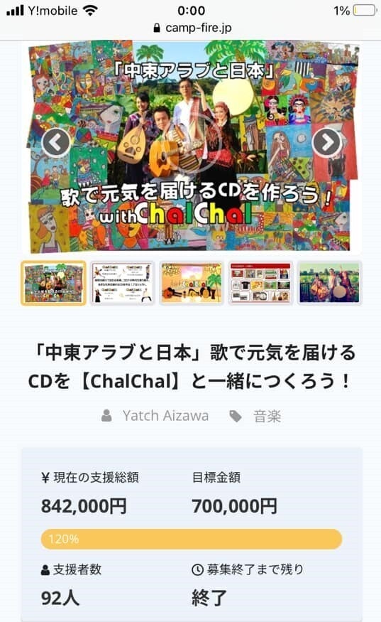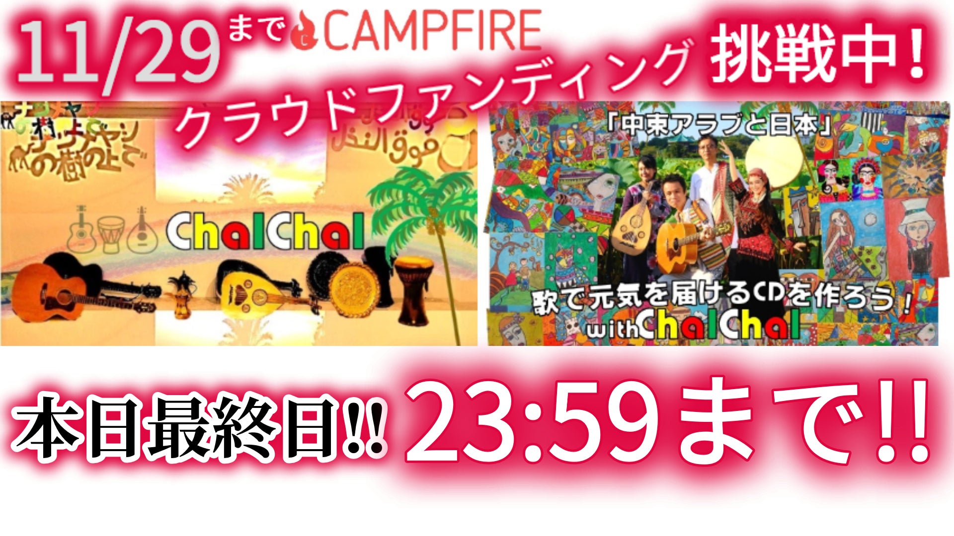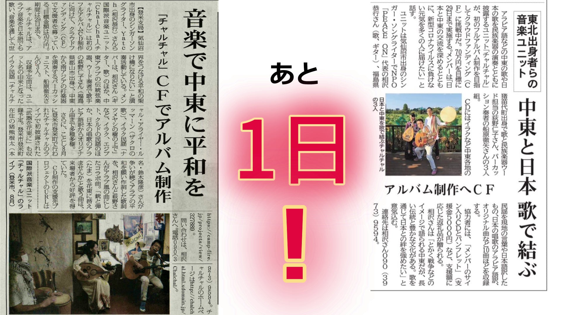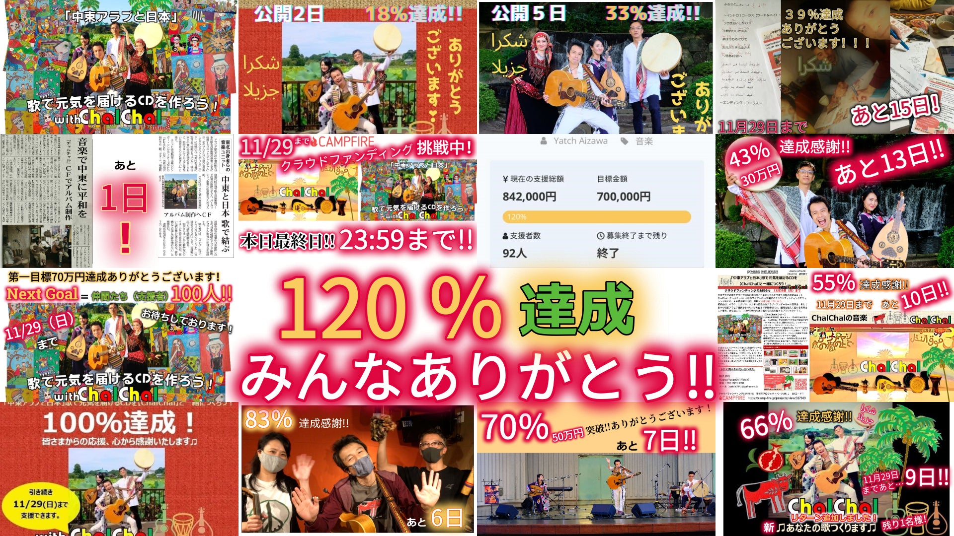 初めてのクラウドファンディングへの挑戦、『「中東アラブと日本」歌で元気を届けるCDを【ChalChal】と一緒につくろう!』はおかげさまで92名のみなさまからご支援いただきまして、目標金額70万円の120%(842,000円)達成して終了いたしました!ChalChalと共に夢をつくる仲間としてご支援いただいたみなさま、本当に、本当にありがとうございます!出だしは好調だったものの、中盤ぴたりと支援が止まり苦しい時期もありました。自分自身の不甲斐なさに打ちのめされそうにもなりましたが、仲間たちが一緒に悩み、どうすればいいかと考えてくれて、何とかめげずに続けることができました。アドバイスからプレスリリースを出した結果、東北の地方紙2紙がカラーで記事にしてくれたり、すでにご支援された方がさらにご友人の方に紹介してくれたりと、後半に入り支援者がぐんぐんと増えてきてくれまして、期限の5日前に第一目標の70万円達成することができました。ネクストゴールは金額ではなく一緒に夢をつくる仲間を募りたいと、支援者100人を目指しました。100人には届きませんでしたが70人から5日で22人も増えて総勢92名の方が仲間になってくださいました。最終日近づくにつれてたくさんの方がシェアなどで広げてくださったり、進捗状況気にされて応援メッセージくださったり、本当に感動的な追い込みで胸が熱くなりました。クラファン募集期間が終わり振り返ると、なんだかお祭りのような一か月でした。連日クラファンのことばかり投稿して申し訳ないなあと思いながらも、なんとしてもやり抜いて成功させるんだと全集中の毎日でした。レコーディングと同時進行でしたが、クラファンも、レコーディングも、これまで生きてやってきたことが良くも悪くもすべて映し出されます。課題だらけの現実が目の前に突き付けられ何度も頭を抱えてしまいました。何かにチャレンジするということは、やはりいくつになっても怖いものです。それでも、その一歩を踏み出してみないと、見えてこない世界があります。今回のチャレンジを通して、今の自分の現実の姿と今立っている場所をしり、これから目指す世界に新しい朝の光が差し込んできました。たとえ惨めに転んでも何度でも立ち上がり、胸を張ってその道を歩いていくんだという覚悟が決まりました。それができるのは、こんなすばらしい仲間がいるから。ChalChalの仲間になってくれて、本当にありがとうございます!クラファン募集は終わりましたが、レコーディングはまだ続いております。年が明けたらCDジャケットやパンフレットの制作、そしてリターンからライブの準備と、このプロジェクトはまさにこれからが本番です。進捗状況は引き続きお伝えしていきますので、今後とも応援どうぞよろしくお願いいたします!