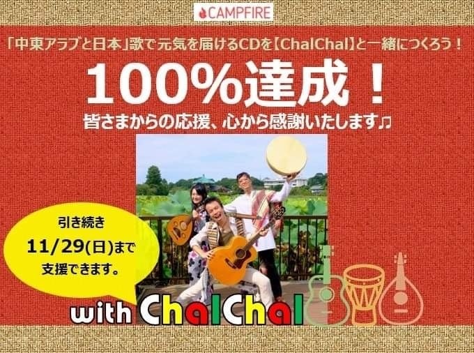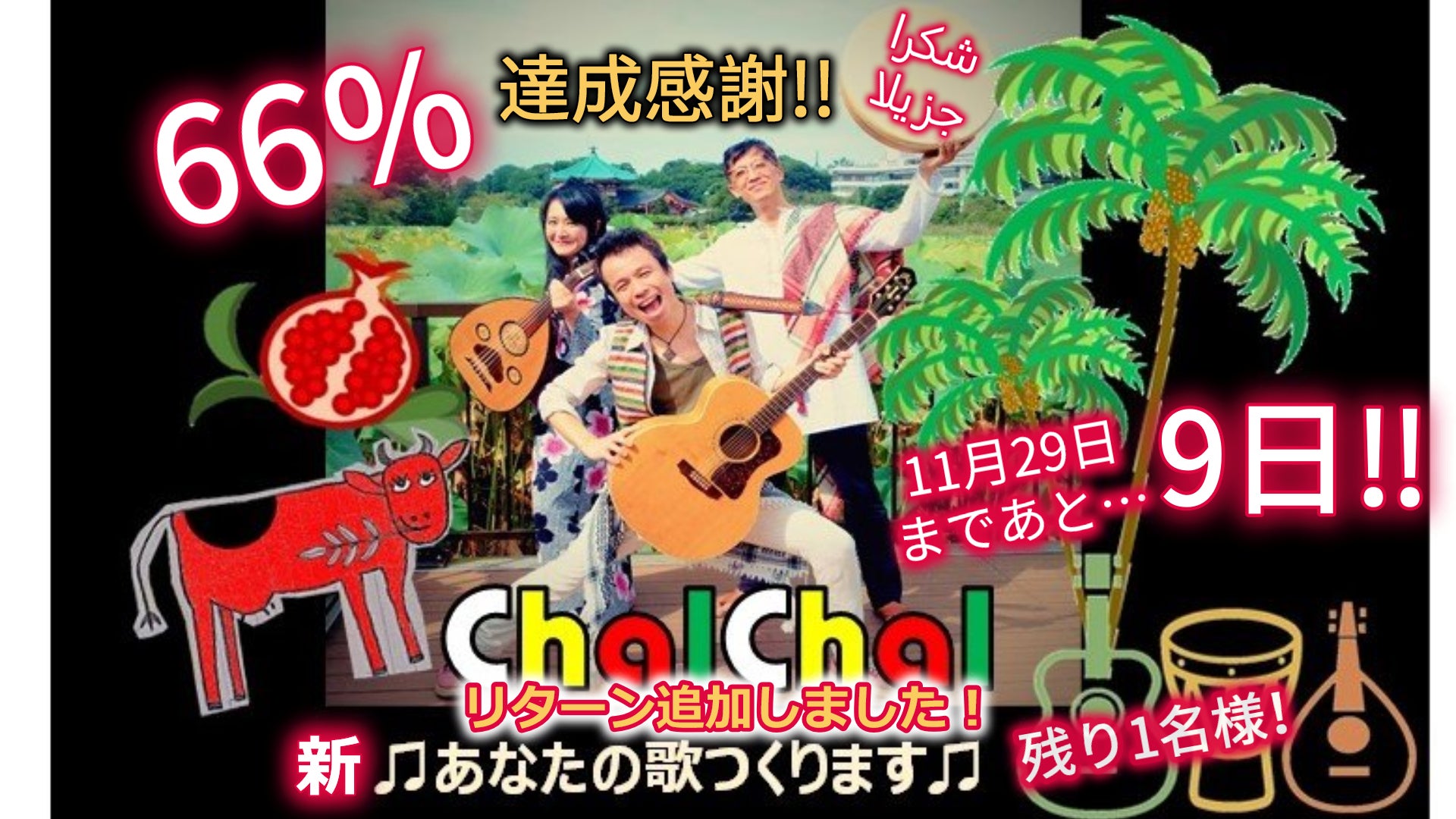 クラファン募集期限の5日前に目標達成できたのは応援してくださったみなさまのおかげです!本当にありがとうございました。心からお礼申し上げます。11月29日まであと4日。通常はネクストゴールとして新たな目標金額を設定するようですが、私たちChalChalはあえて金額は設定せずに、一緒にプロジェクトを作ってくれる仲間を募集します!レコーディング、CD制作、リターン、ライブ、そしてMV制作をはじめその後の活動をより豊かで実りあるものにしたい。そのために資金はもちろん必要ですけど、この度はじめてクラファンにチャレンジしてみて、一番大切なのは一緒に夢をつくっていく仲間たち、そしてそれを応援してくれる仲間たちなんだと改めて気がつきました。おかげさまでこれまで70人を超える方々が仲間(支援者)になってくださいました。苦しい時、仲間たちからの励ましにどれだけ支えられてきたことでしょう。本当に感謝しています。そういうわけで募集期限の11月29日まで、さらなる仲間を募集します!ネクストゴールは共に夢をつくる仲間(支援者)100人!支援するつもりだったけど、またはなんとなく気にはなっていたけど、もう目標達成したからいいのかな?と思っている皆様も、どうか遠慮なく仲間になってほしいです。すでに支援いただき仲間になってくれたみなさまも、シェアなどで新たな仲間を紹介してくれたら嬉しいです。中東アラブと日本をつなげてコロナを乗りこえる元気を世界に届けるという夢を、ChalChalと一緒につくっていきましょう!